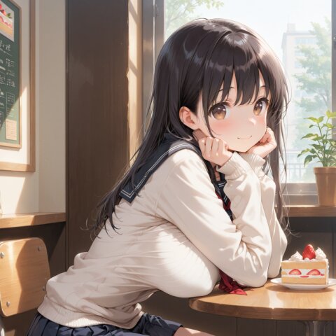 masterpiece, best quality, amazing quality, general, fine detail, official art, 1girl, loli, school sailor uniform, black sailor shirt, long sleeves, black sweater, miniskirt, black thigh-high socks, beautiful blonde hair, beautiful blue eyes, beautiful legs, big breasts, impossible clothes, perky breasts, in cafe, innocent expression, sitting on chair, happy, strawberry shortcake on table,