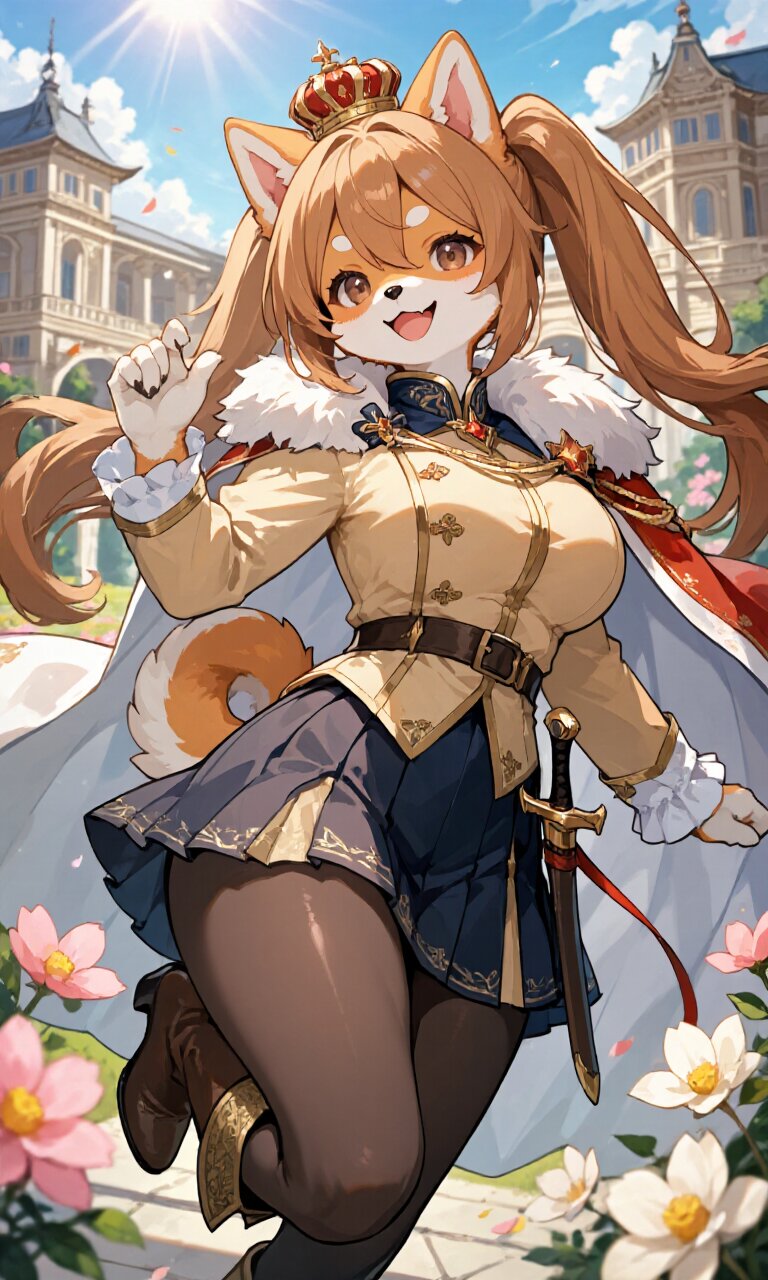 A stunningly detailed and beautiful 1girl (dog girl) of a (shiba-inu girl) with prominent (furry:1.3) features, including shiba-inu ears perked upright, a soft dog nose and snout, and a fluffy, curled tail. Her (body fur:1.2) is meticulously rendered, with stand fur and a plush, fluffy texture. She has (large breasts), thick thighs, and a slender yet curvaceous figure. Her long, light-brown hair is styled in high twin tails, with white thick eyebrows and a strand of (hair between eyes). Her round brown eyes sparkle with happiness as she beams a cheerful, (cute face) smile. She wears a (palegoldenrod luxurious Prince costume:1.6) with intricate embroidery, long sleeves, and a (luxurious White Cape:1.3) flowing behind her. Her outfit includes a (luxurious Navy mini skirt:1.4), black pantyhose, and elegant (Brown luxurious Boots:1.3). A finely crafted (dagger on waist:1.3) gleams at her hip, and she wears a (luxurious crown on head:1.4). The background features a grand Palace with Japanese retro architecture, surrounded by blooming Japanese flowers under a blue sky in the afternoon. Sunlight casts warm sunbeams and lens flares across the scene, enhancing the romantic academia atmosphere. The artwork is a masterpiece with insanely detailed hair, clothing, and skin, exuding a regal yet playful charm.