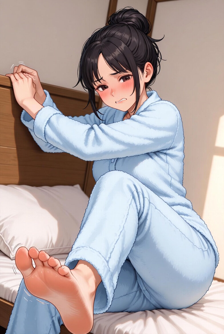 An illustration of a Japanese woman in her 20s trying to get out of bed in the morning, experiencing a calf cramp and unable to move due to pain, wearing a fluffy winter pajama.