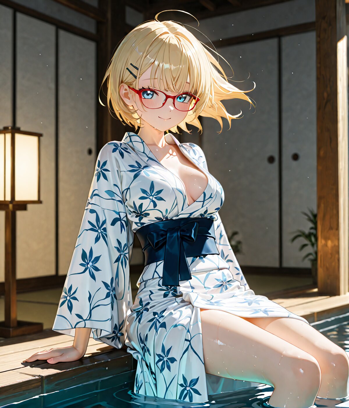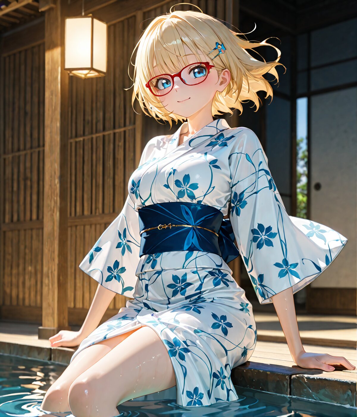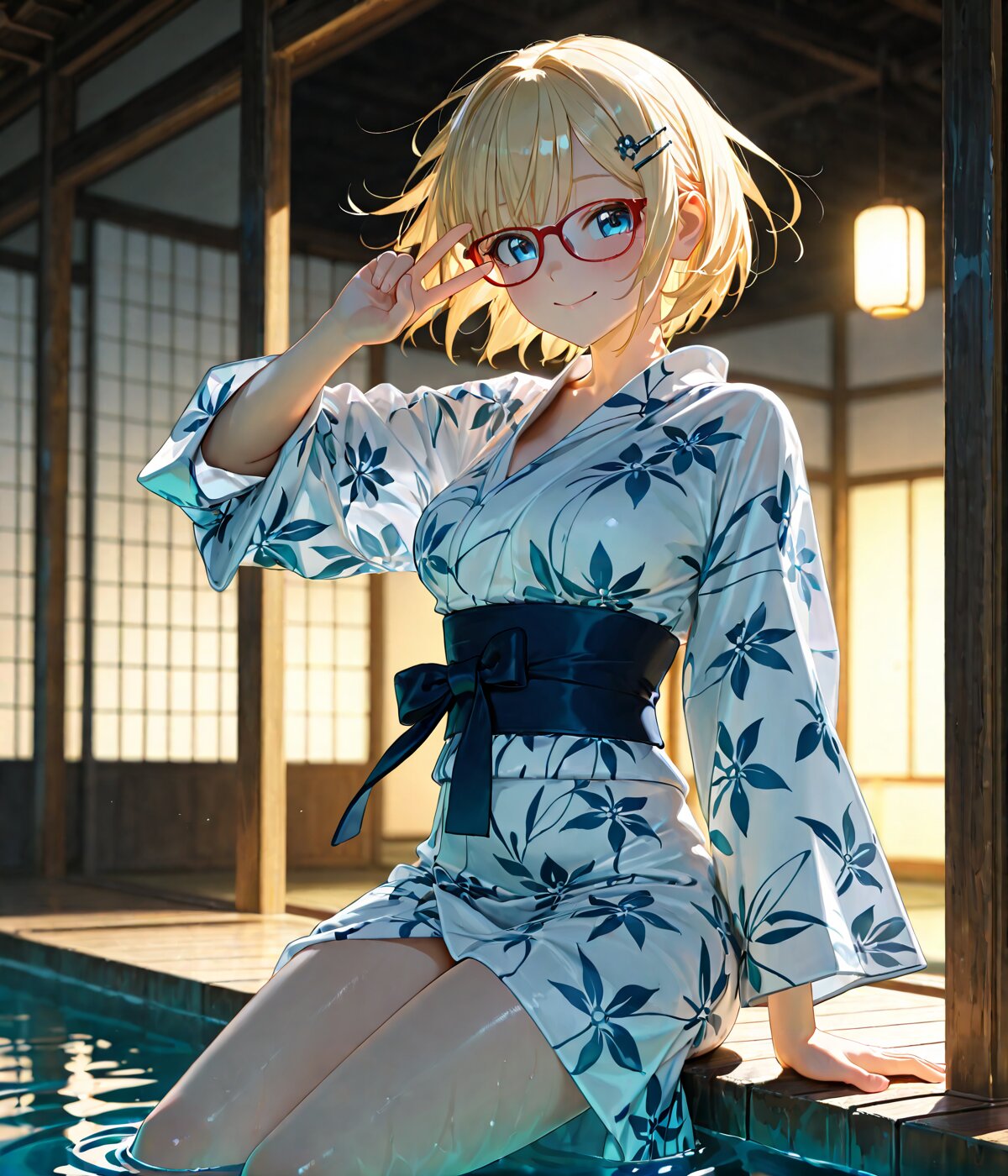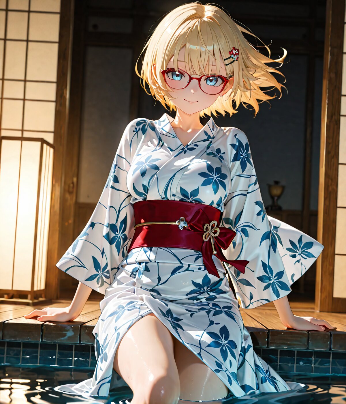 masterpiece, best quality, amazing quality, 4k, very aesthetic, high resolution, ultra-detailed, absurdres, newest, scenery, 3d, rendered, backlit, red glasses, blonde hair, hairpin, short hair, choppy bangs, =v=, blue eyes, white blue, 1girl, yukata, medium breasts, cowboy shot, portrait, dynamic, soaking feet, floating hair, BREAK, hands, fingers, vignetting, dramatic shadow, cinematic lighting, rim light, detailed background, depth of field, vignetting, volumetric lighting