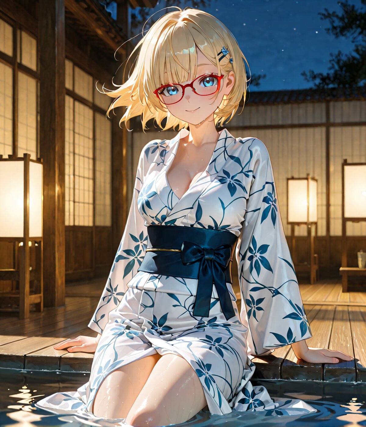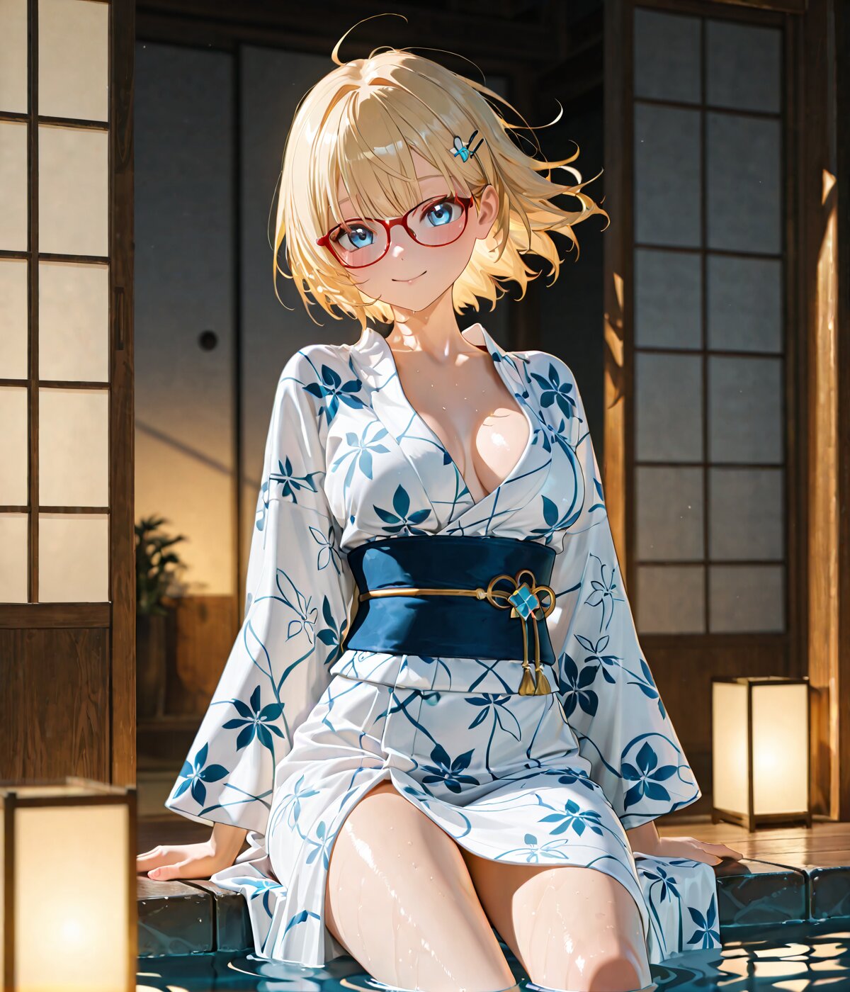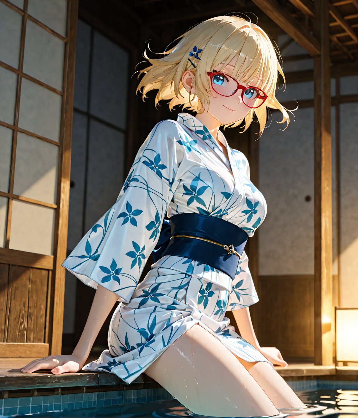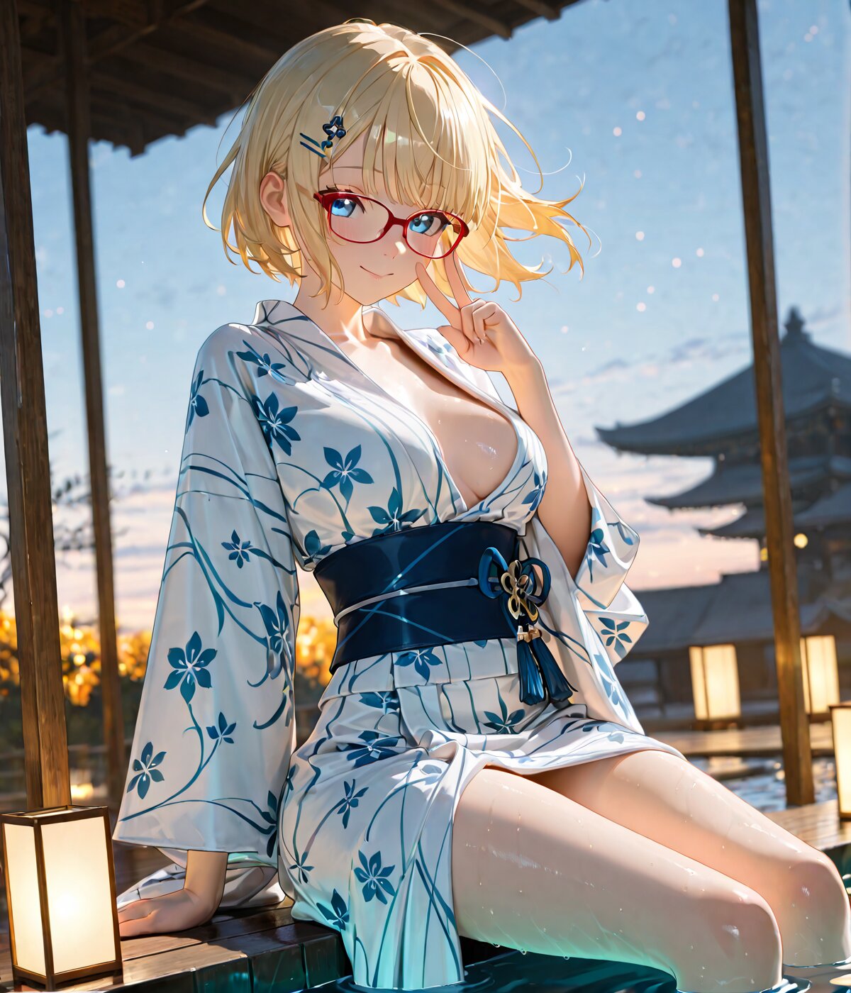 masterpiece, best quality, amazing quality, 4k, very aesthetic, high resolution, ultra-detailed, absurdres, newest, scenery, 3d, rendered, backlit, red glasses, blonde hair, hairpin, short hair, choppy bangs, =v=, blue eyes, white blue, 1girl, yukata, medium breasts, cowboy shot, portrait, dynamic, soaking feet, floating hair, BREAK, hands, fingers, vignetting, dramatic shadow, cinematic lighting, rim light, detailed background, depth of field, vignetting, volumetric lighting