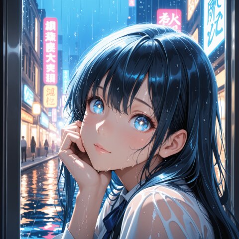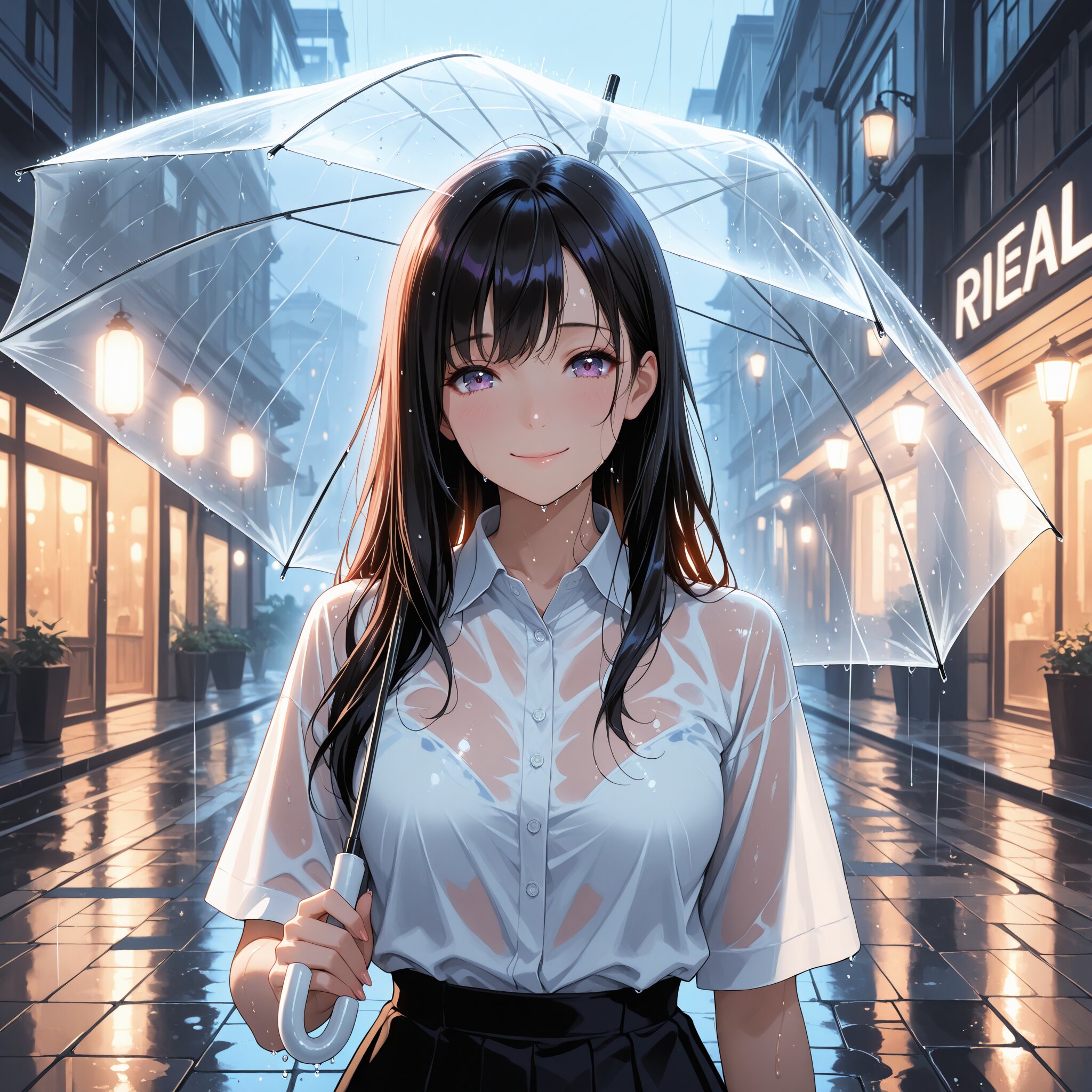 masterpiece, best quality, photorealistic, sharp focus, cinematic lighting, depth of field, beautiful composition, vibrant colors, ultra high res, 8K, highly detailed, masterpiece, best quality, very detailed, ethereal anime girl holding transparent umbrella in heavy rain, backlit by streetlamp, wet clothes semi-transparent, long hair flowing, gentle sad smile looking over shoulder, neon reflections on wet pavement, dreamy atmosphere, cinematic lighting, ultra detailed