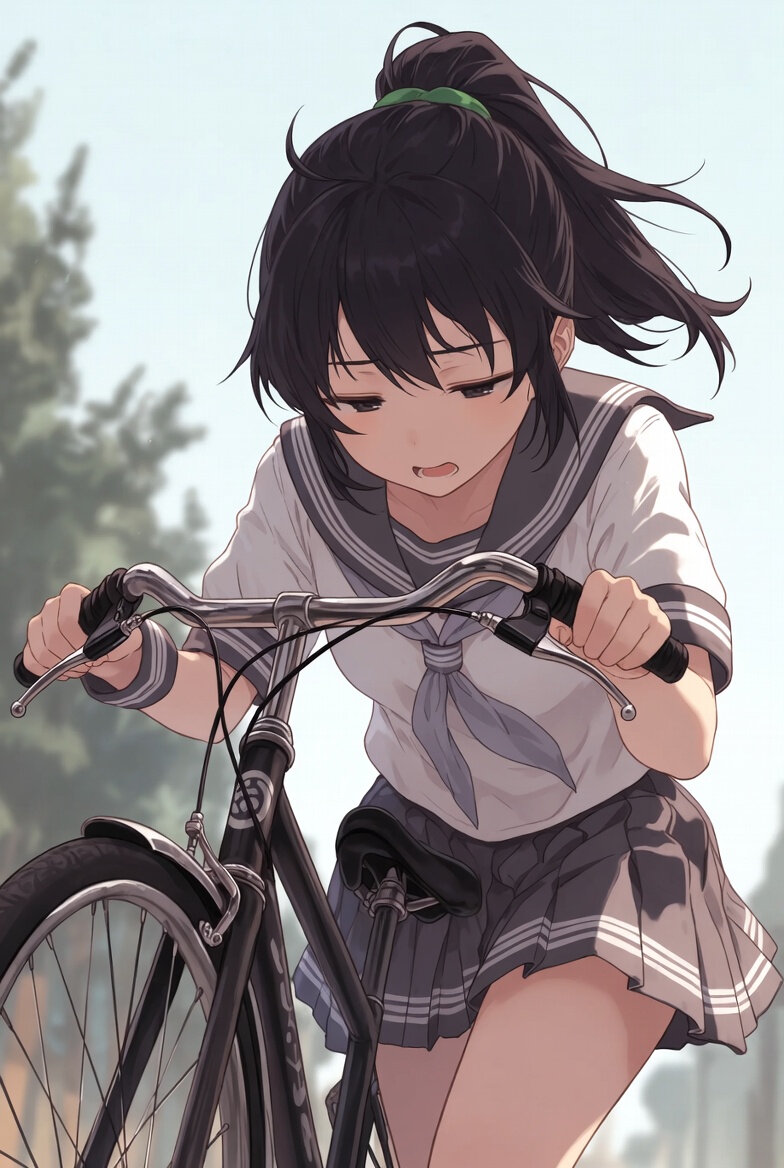 Grok Imagineでは、自転車を降りて押すという抽象度の高い状況の解釈が、難しいようで。人体と車体の位置関係がチグハグになる画像が多かった。採用した画像はあおりの構図で、比較的車体が少ない。