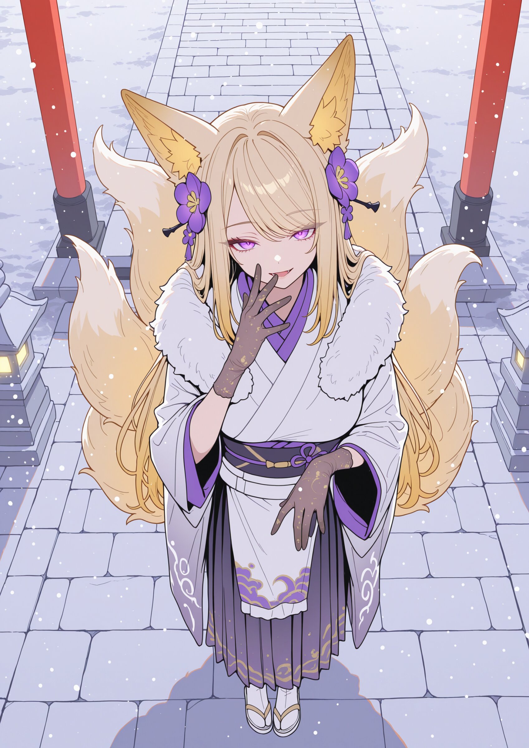 front view, from above, looking up, (portrait:1.2), dynamic angle, looking at viewer, (gradient white background:1.1), drop shadow, colored shadow, blue sky morning light, The background is a solid, bright muted color hazel brown, creating a striking contrast with the intricate, multi-colored design of the character, (ink wash effect:0.9), pop color background, (high saturation:1.2), winter coloring, winter atmosphere, divine atmosphere, sacred aura, morning torii, shrine, stone floor, stone lantern, komainu, snowing, 1girl, fox girl, gold Blond Hair, large breasts and fox ears, (swept bangs:1.2), (perfect purple eyes:1.3) long eyelashes aristocratic features tall girl has (Blond Hair long hair over ears:1.3) fox 9tails, (wearing White Japanese Cloth straw sandal precise silk gloves long skirt Obi boots:1.3), hair ornament flower, tabi, long sleeves, winter scarf, (fur trim:1.1), black thighhighs, mysterious atmosphere, seductive smile, bored, sleepy, yawning, zombie pose , new year theme, super fine concept art, unreal engine, graceful eyes, masterpiece, best quality, amazing quality, very aesthetic, absurdres, newest, professional art lots of details, , overexposure, sumie effect style, 4ur4_illu,shiny, glowing, glowing particles, glowing light particles, light particles, mud, <lora:noline (1):-0.5> <lora:sdxl2-flat2-512b:0.2> <lora:facelightup_xl_v10:0.5> <lora:V2_yakumo_alchemy:0.5> <lora:Aura_illu:0.1>