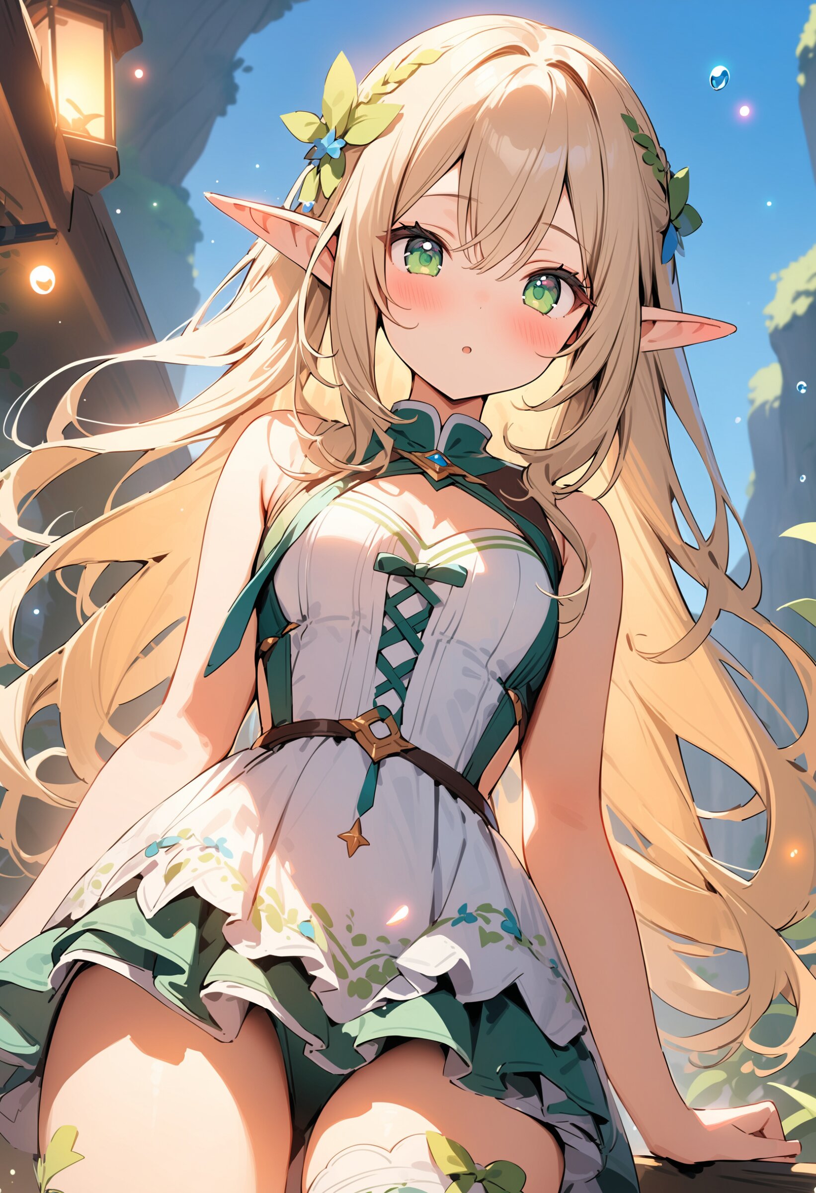 ((masterpiece)), ((best quality)), ((kawaii)), cute, (lovely), ((extremely detailed)), (beautiful), dynamic angle, a cute girl, 1girl, solo, ((elf)),beautiful blond hair, beautiful green eyes, ((beautiful eyes)), long hair, fantasy clothes,