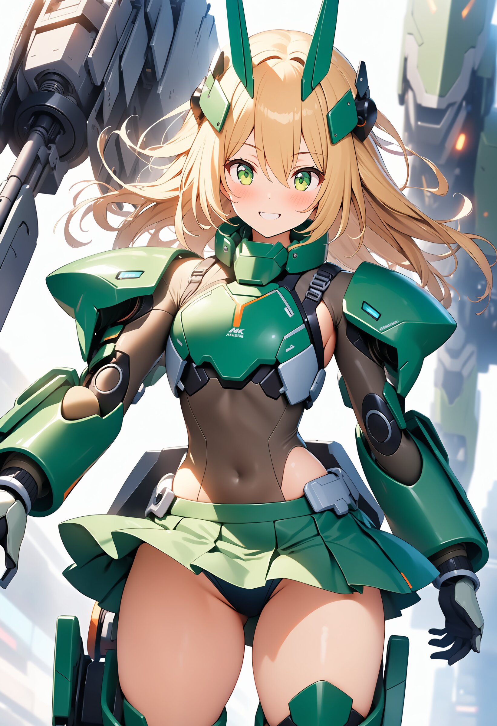1girl, ((white background)), ultra detailed 8k cg render, masterpiece, high resolution, extremely detailed, mecha musume,mecha shoulder, mech leg, headgear, mecha armor, ((mini skirt)),long blonde hair, dropping green eyes, smile, dynamic posing,
