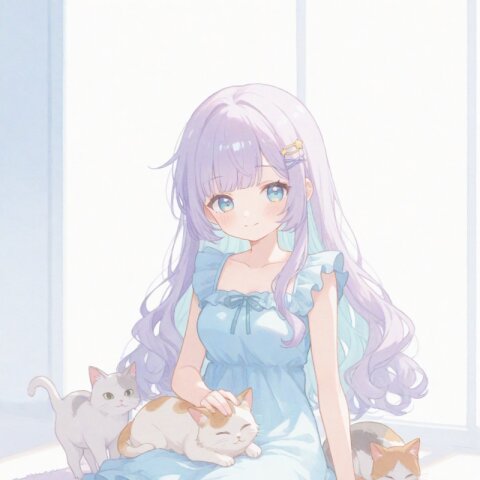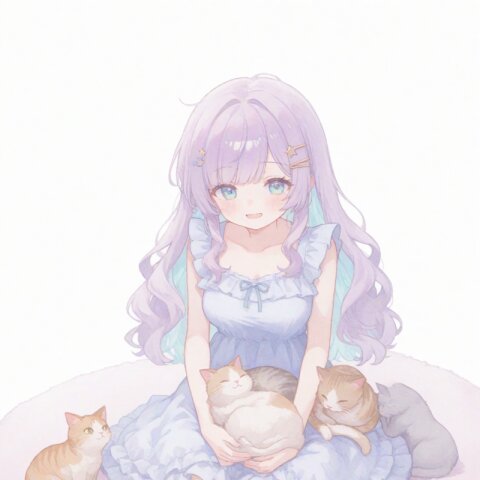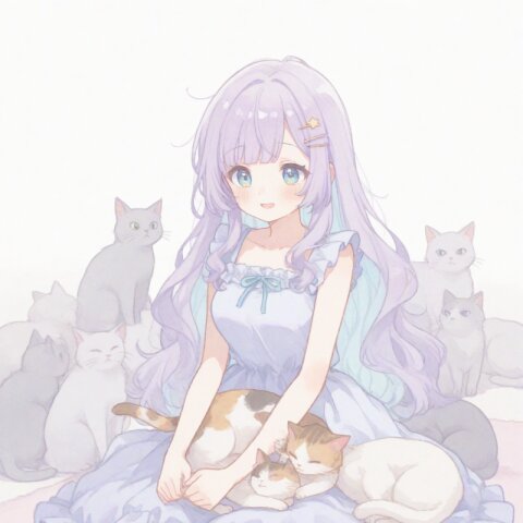 (masterpiece), (soft pastel color palette:1.5), 1girl, lavender hair, light blue inner hair, side buns, purple eyes, futuristic cyber-neon miko outfit, short kimono, glowing circuitry, holographic charms, yume-kawaii, watercolor texture, flat color, soft lighting, crisp anime lineart