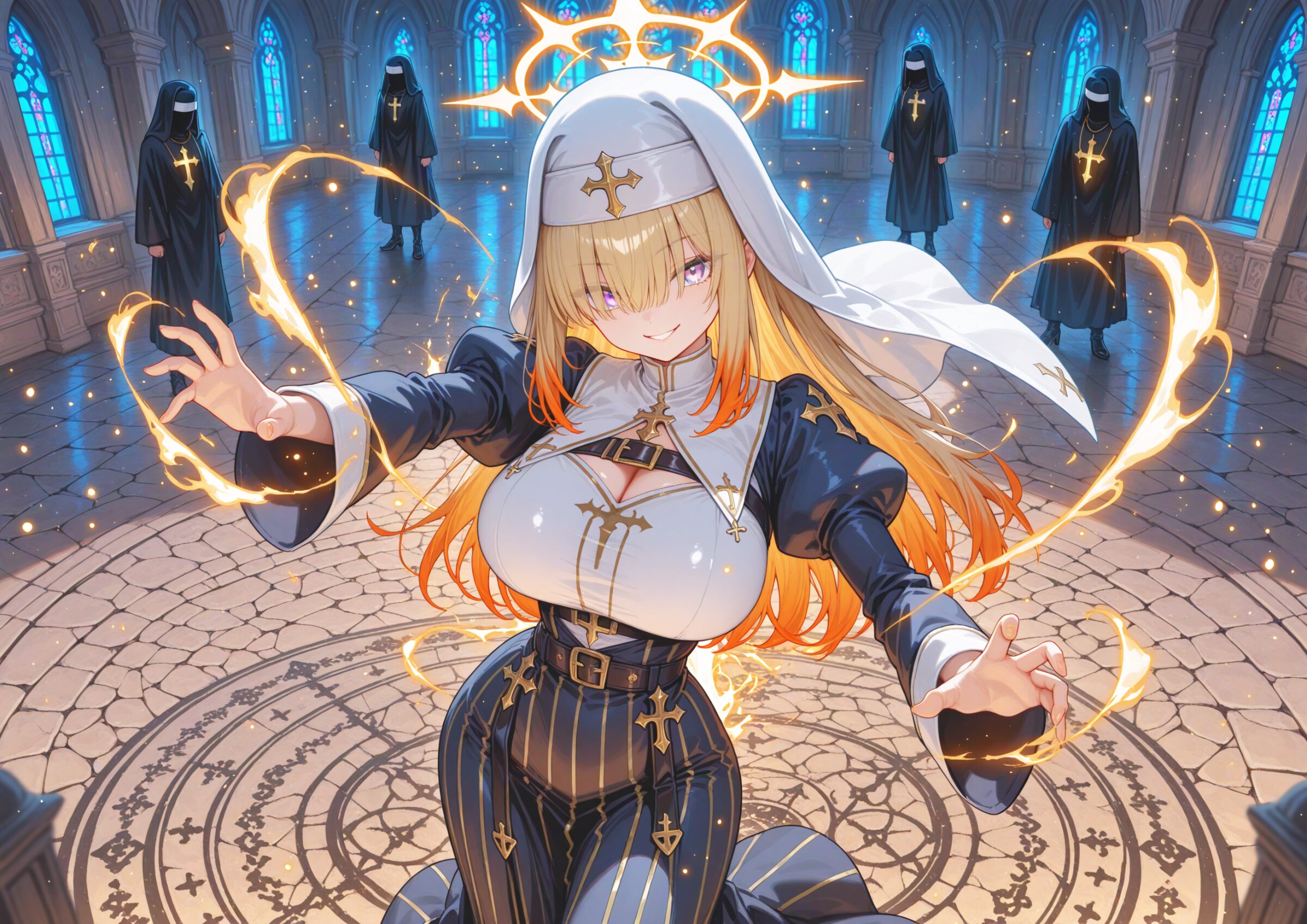 straight-on cowboy shot, (blurry foreground:1.1) (from above,looking up:1.0) looking at viewer drop shadow, night church, battle against demon, combat, (silhouette of demon:1.2), duel, 1girl, nun, beautiful detailed eyes, holy face, cool Elegant and sophisticated demeanor, (redness skin:1.0), skindentation, beautiful silver eyes, , blonde hair, orange colored tips, chest length hair, straight hair hair over eyes , Smooth and silky hair, first-rate female bodies perfect body beautiful huge breasts wide hips, narrow waist, nun, Good texture priest's hat, white plain cape, cloak, religious Coat, juliet sleeves, the feel of silky, , belt buckle, chest belt, , , , long skirt, (silk overskirt:1.0), vertical-striped high-waist pantyhose, high heel boots, shiny smile, (teasing smile:1.2), sacred magic circle, divine wind, kung fu attack, kung fu pose, kung fu action, upright straddle , (swirling energy,energy magic,energy:1.2), fighting stance, super fine concept art, hard surface, 8K, masterpiece, best quality, amazing quality, very aesthetic, absurdres, professional art lots of details, , overexposure, shiny-glistening, (watercolor style:0.5), (pastel color style:0.0) 4ur4_illu,shiny, glowing, glowing particles, glowing light particles, light particles, <lora:noline (1):1.0> <lora:sdxl2-flat2-512b:0.0> <lora:facelightup_xl_v10:0.5> <lora:V2_yakumo_alchemy:0.5> <lora:Aura_illu:0.1>
