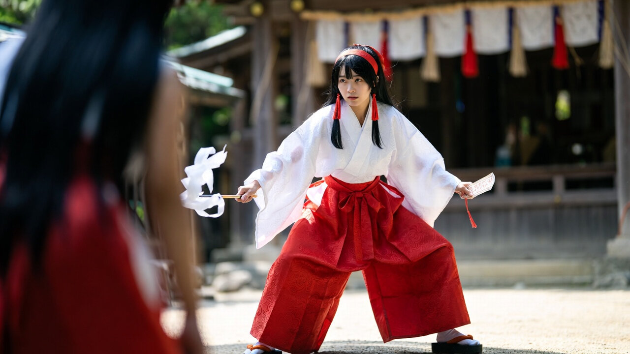 A 20-year-old Japanese woman dressed as a shrine maiden, fighting a yokai. She is wearing a traditional white kimono paired with a long red hakama skirt. She has long black hair tied at one point near the ends with a red ribbon and wears a red headband. In her right hand, she holds a purification wand, and in her left hand, she holds an ofuda. She is wearing sandals. Full body view.