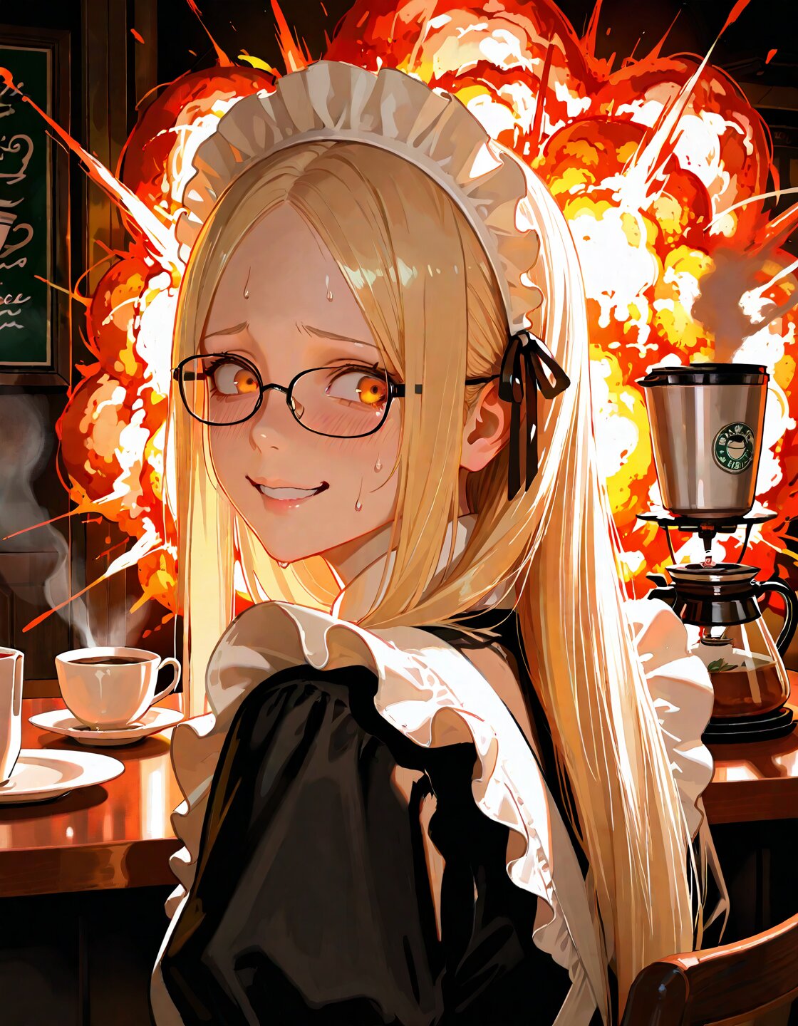 solo,long hair,straight hair,forehead,center parted bangs,blonde hair,amber eyes,delicate face,detailed face,detailed skin,masterpiece,best quality,insanely detailed,beautiful,16k,photorealistic, nervous smile,panicking,flustered,looking back,nervous sweating,maid,lace,ribbon,maid style headdress,Scene of Tension,in the cafe,Coffee shop,traditional English style,glasses,tea,tea brewing,burning-edge,dynamic lighting,glowing,chill atmosphere,danger,(with a big explosion in the background:1.5),bloom,soft lighting