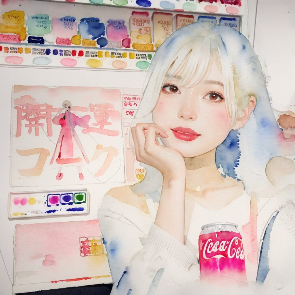 best quality, masterpiece, (watercolor painting:1.48), (line art:1.3), (illustration:1.2), (cel anime:1.1) Portrait,dramatic lighting, natural shadow, japanese, 1 cute girl,(smile:0.86), half updo, eyes detail, round face:1.2, shaded face, (looking at viewer:1.2), Casual knitwear,(hands on coke:1.2),
