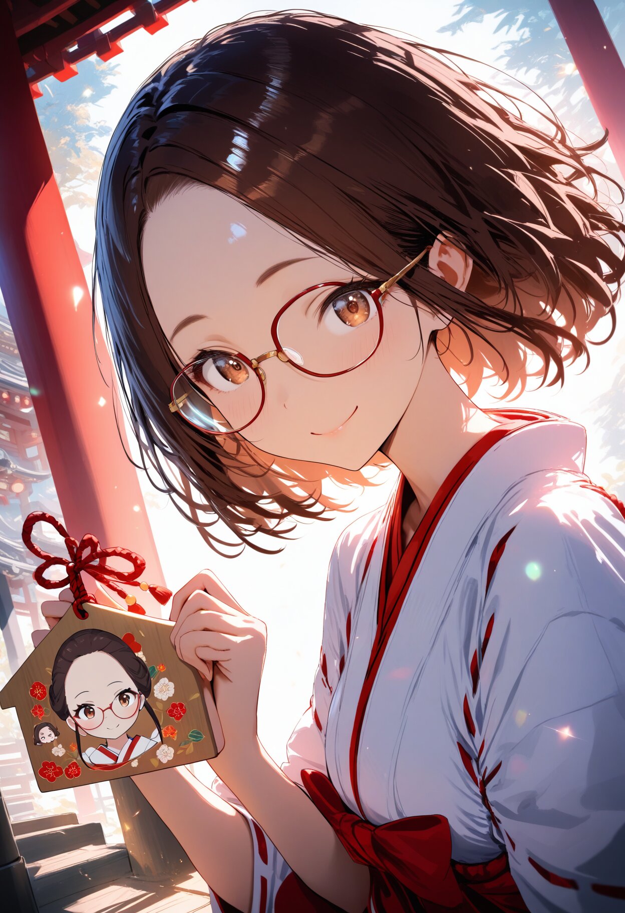 holding ema, shine, smile, shrine maiden, lady, forehead, glasses, brown hair, brown eyes, short hair,