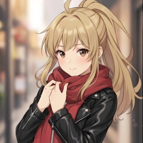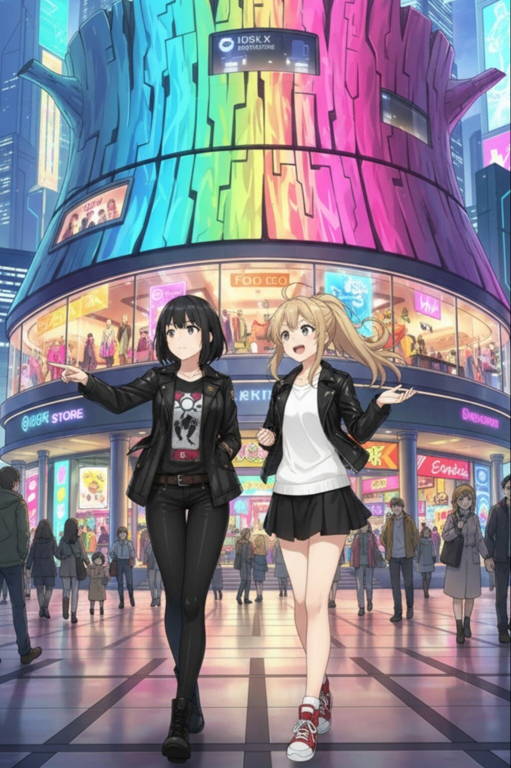 Two young women walking on a bustling futuristic city street at night. One has short black hair and is wearing a black leather jacket over black clothing. The other has long blonde hair in pigtails, wearing a white t-shirt, a black skirt, and a black leather jacket. In the background, there is a large, round, rainbow-colored building that looks like a shopping mall, illuminated with neon lights. Many people are walking around them. Anime style, vibrant colors, detailed cityscape.