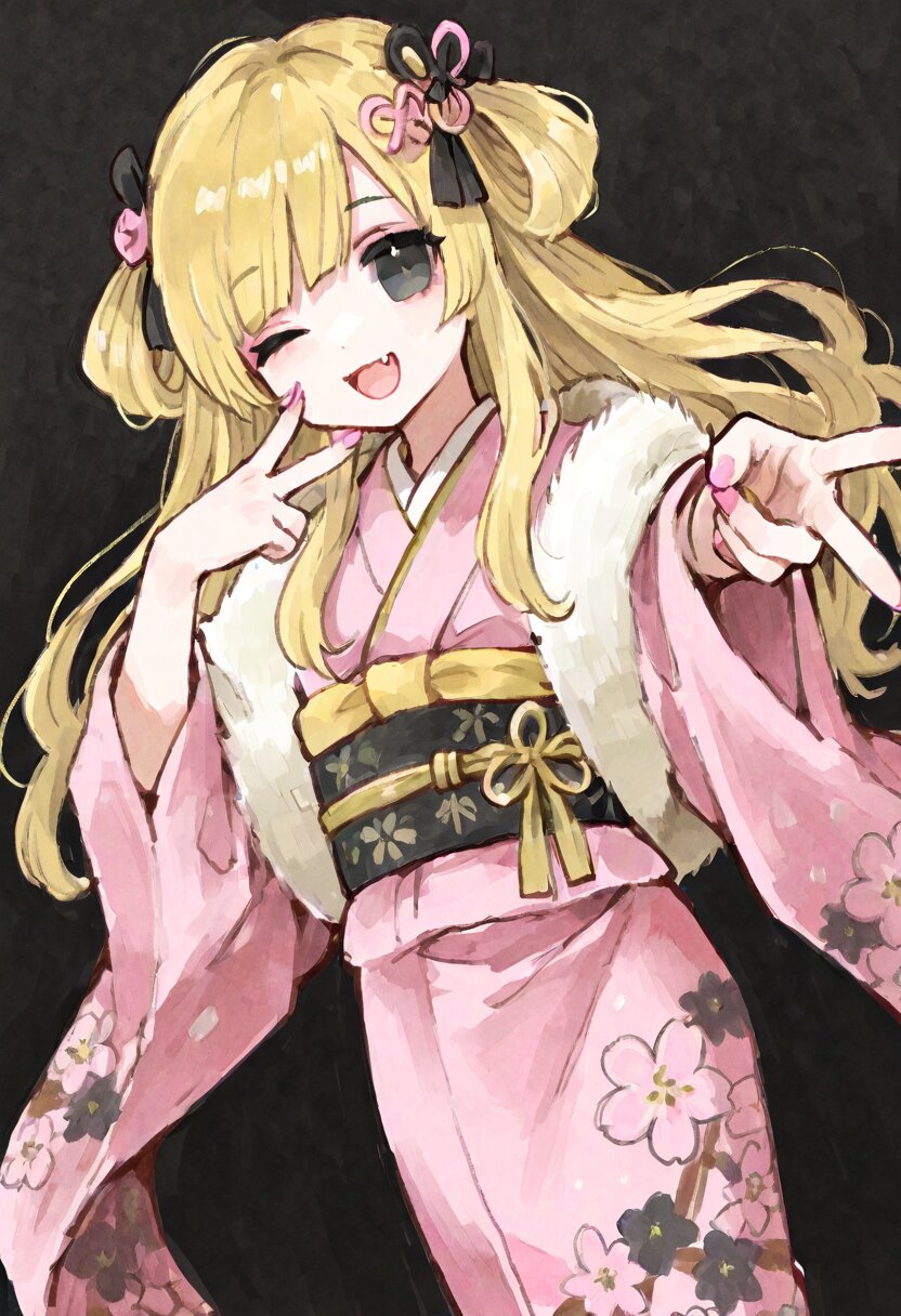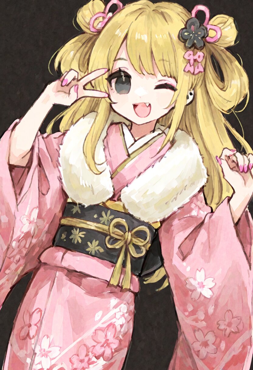 <lora:inmnstyleilxl:0.9>, ultra-detailed, best quality, masterpiece, very aesthetic, watercolor painting, general, solo, 1girl, dutch angle, vivid pink kimono, furisode, gold embroidery, white fur shawl, black obi, gold waist ribbon, black Japanese knot hair ornament, pink decorated nail, gyaru v, yellow hair with black roots, black eyes, smile, open mouth, fang, wink, closed one eye, cowboy shot, black background, looking at viewer