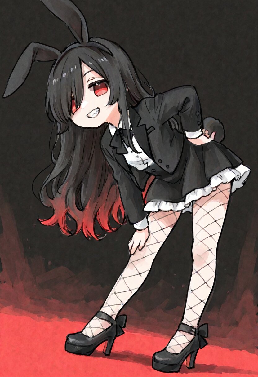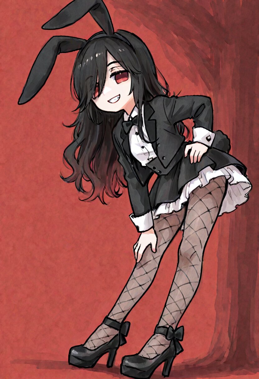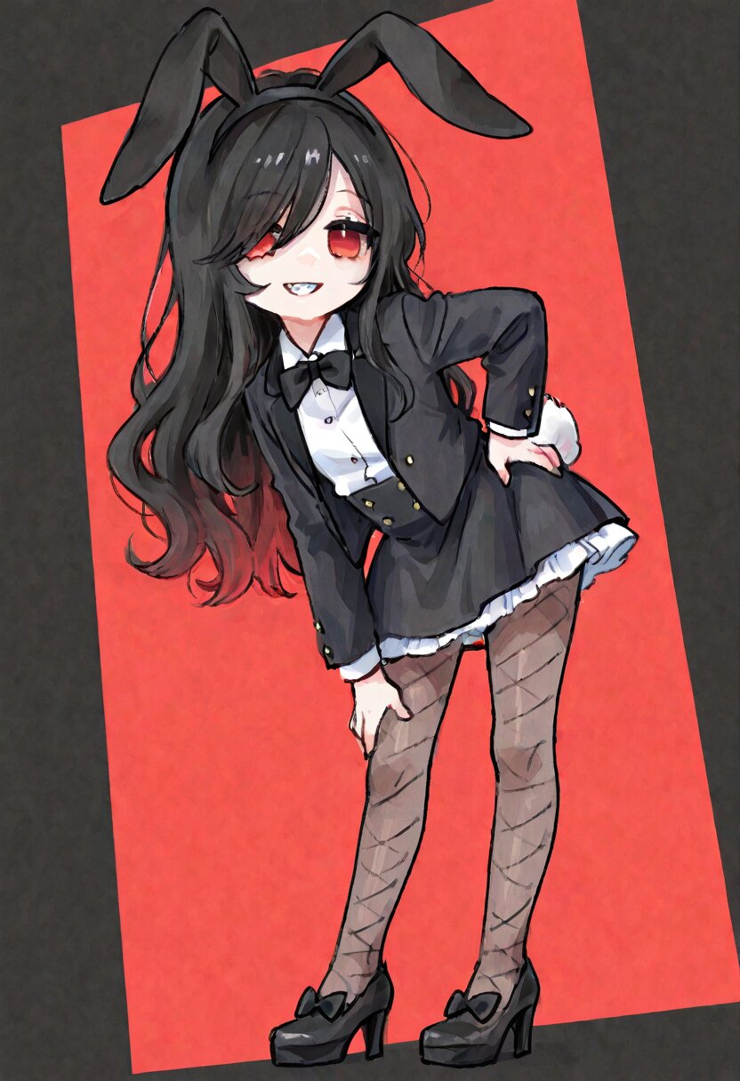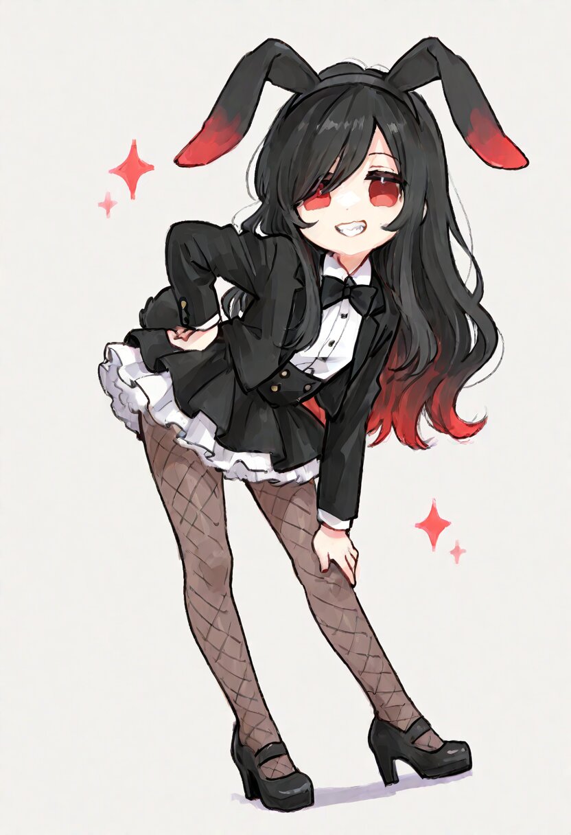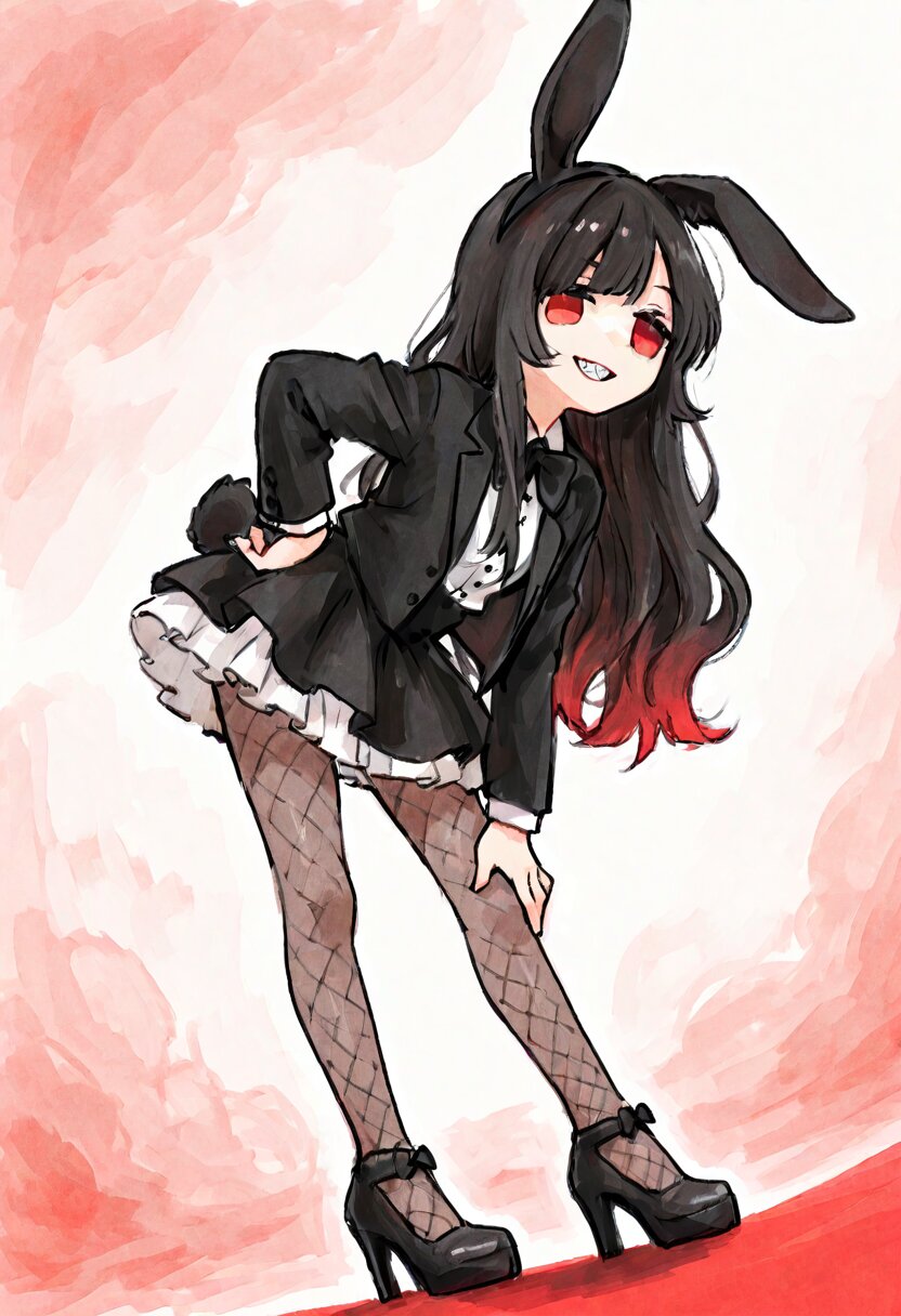 <lora:inmnstyleilxl:0.9>,ultra-detailed, best quality, masterpiece, very aesthetic, watercolor painting, general, chibi, solo, 1girl, low angle, black rabbit ears headband, rabbit tail, white shirt, black tuxedo jacket, black bow-tiew, black mini skirt, white petticoat, fishnet tights, black highheels, leaning forward, hand own hip, looking at viewer, smile, grin, sharpe teeth, black hair, long hair, wavy hair, long bangs, red colored tips hair, red eyes, jitome