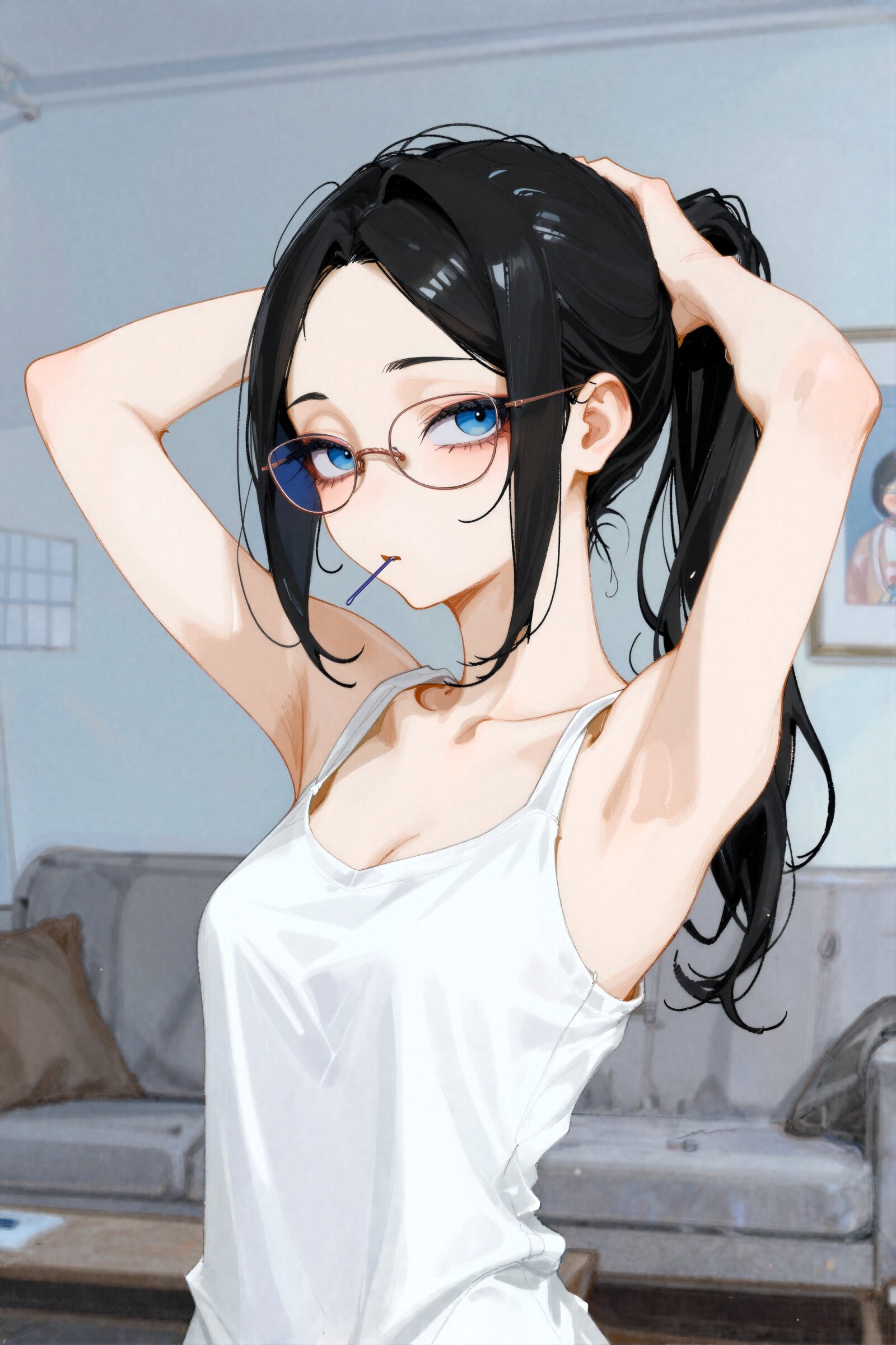 Scene: A woman posing casually in a room. Character: A woman with pale skin and vertical gradient eyes shifting from deep blue to sky blue. Her pale nape is exposed, and a few loose strands of hair add a subtle sensuality. She is wearing a white camisole and slim-rim glasses. Action: She has both hands behind her head, gathering her hair into a ponytail. A hair pin is held lightly between her lips. Environment: A simple, clean living room with a cool-toned atmosphere. Style: Soft rendering, clean noise, flat drawing approach. Anime-style illustration with gentle shading and smooth lines. Mood: Casual, playful, relaxed, and subtly charming. Technical: Side view, slight Dutch angle.