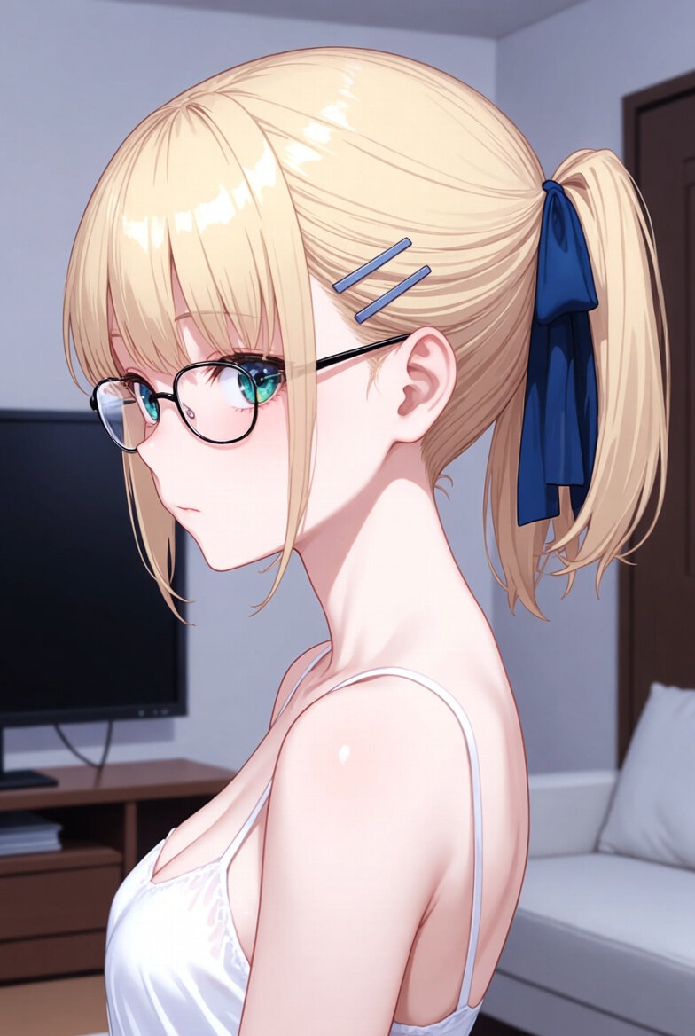 Scene: A woman posing casually in a room. Character: A woman with pale skin and vertical gradient eyes shifting from deep blue to sky blue. Her pale nape is exposed, and a few loose strands of hair add a subtle sensuality. She is wearing a white camisole and slim-rim glasses. hair style :ponytail with navy ribbon. A hair pin is held front of head. Environment: A simple, clean living room with a cool-toned atmosphere. Style: Soft rendering, clean noise, flat drawing approach. Anime-style illustration with gentle shading and smooth lines. Mood: Casual, playful, relaxed, and subtly charming. Technical: Side view, slight Dutch angle.