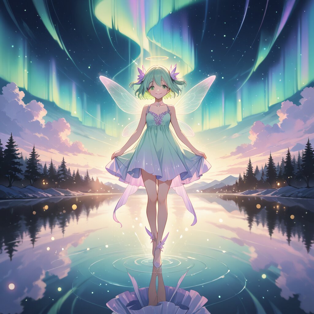 cute delicate fairy girl, flowing pastel dress, tiny sparkling wings, gentle smile, floating over glassy reflective lake, beautiful soft aurora borealis in sky, tender pink lavender mint green northern lights, perfect water reflection, dreamy ethereal light particles, misty romantic atmosphere, niji journey style, anime key visual, soft cel shading, very gentle colors, glowing softly, bokeh, masterpiece, extremely detailed