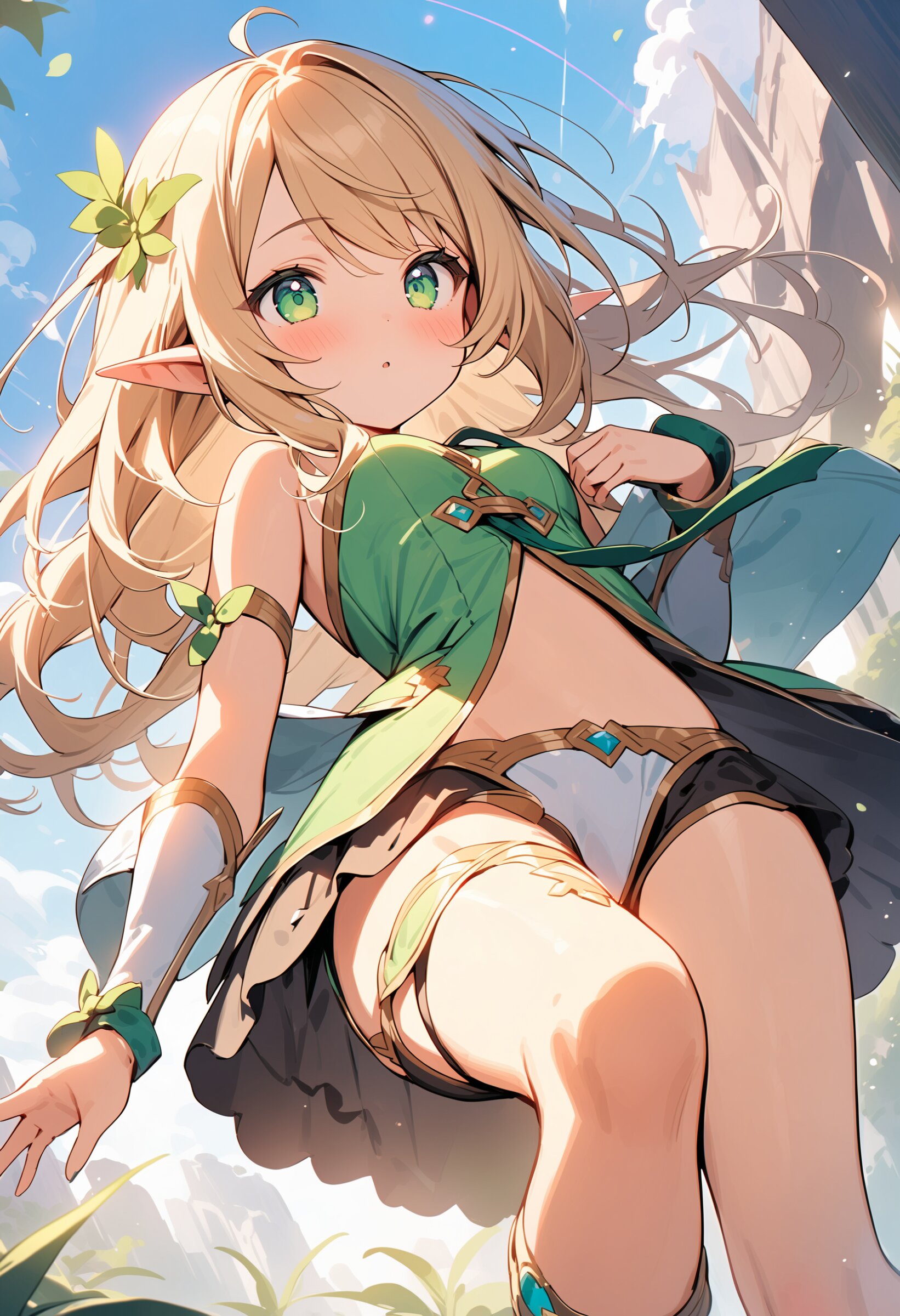 ((masterpiece)), ((best quality)), ((kawaii)), cute, (lovely), ((extremely detailed)), (beautiful), dynamic angle, a cute girl, 1girl, solo, ((elf)),beautiful blond hair, beautiful green eyes, ((beautiful eyes)), long hair, fantasy clothes,