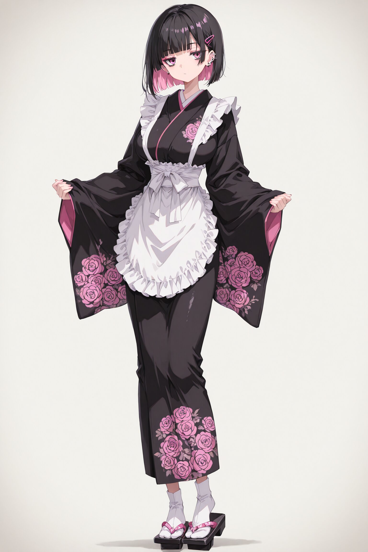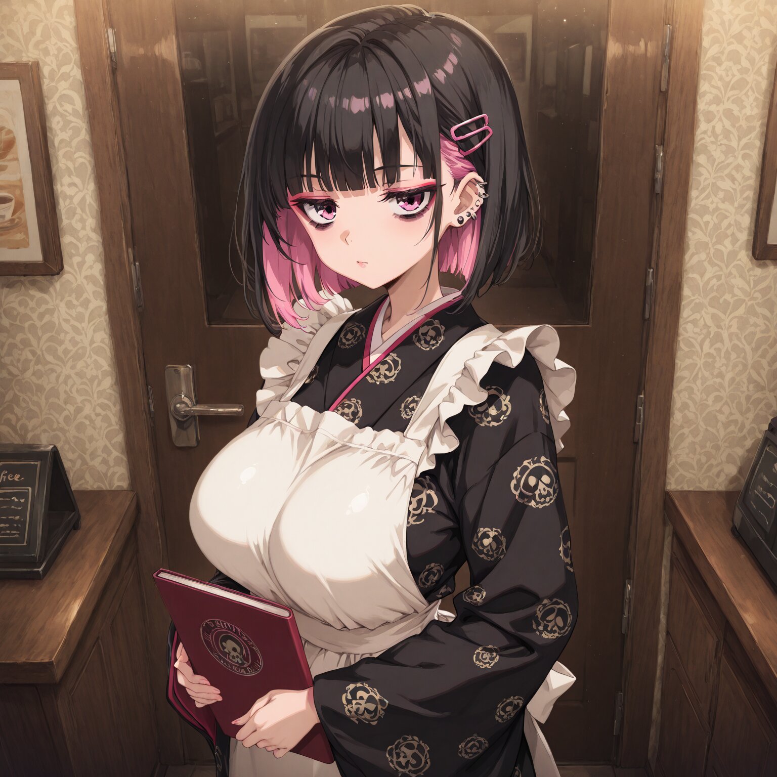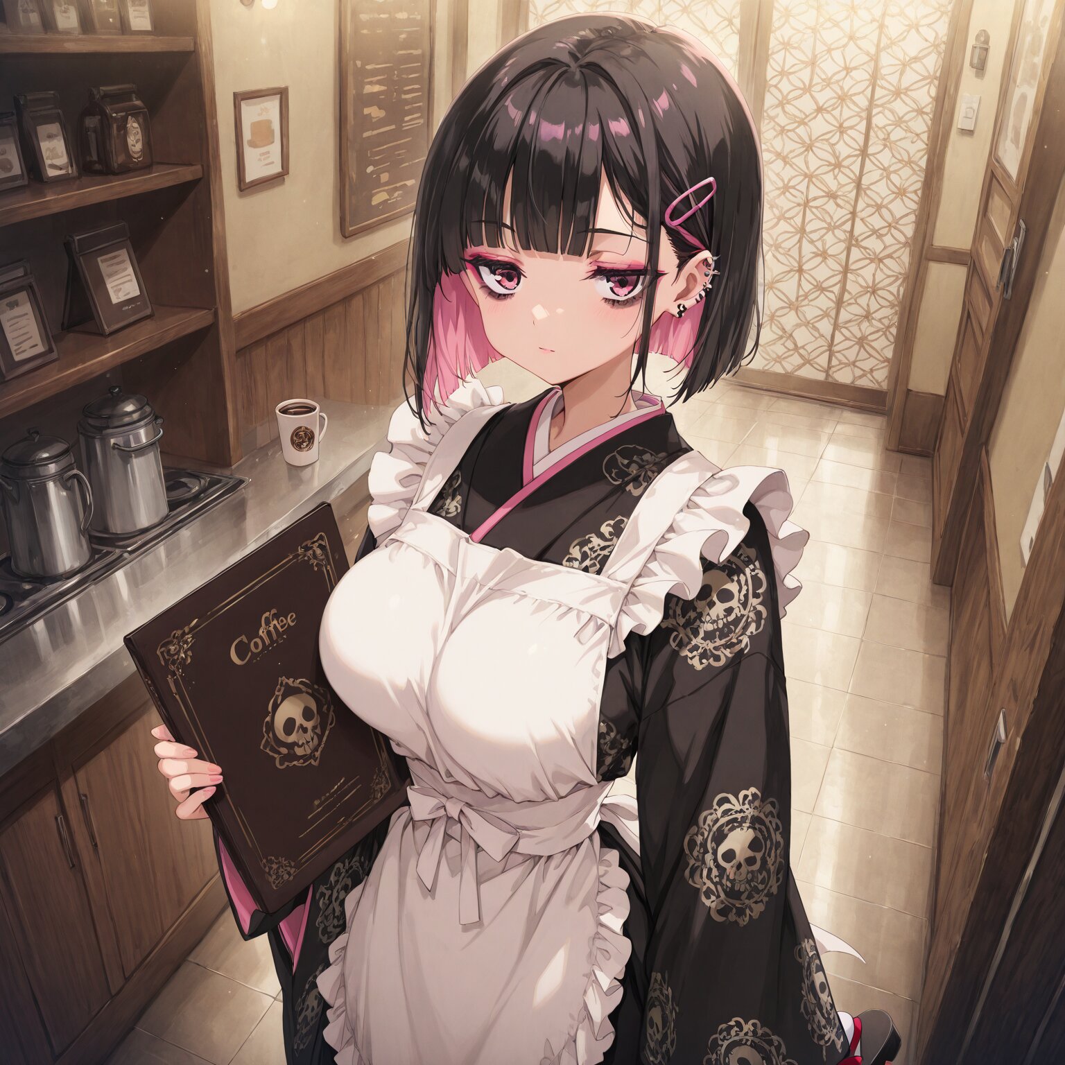 (1girl), young female, BREAK (makeup), deep makeup , eye moles under eyes, heavy eye shadow, ((gothic lolita, lolita fashion)) (Sharp eyes), (pink eyes), hime cut, blunt bangs, ((Bob hair:1.3)), ((black hair)), ((pink inner hair:1.2)), many piercings, (pink hair clip) BREAK, slim, small waist, hyper breasts BREAK, Slender, narrow waist, toned body, athletic body, shiny skin, beautiful pupils jitome Black kimono, skull pattern, gold pattern, ruffles, and ribbon. Apron, geta sandals, and tabi socks. Holding a menu. Coffee shop interior, retro, Western style. BREAK, (newest, anime, animation, anime screen capture, anime style:1.3) BREAK, (masterpiece, , vibrant, very aesthetic, highly detailed, best quality, 16k:1.3)
