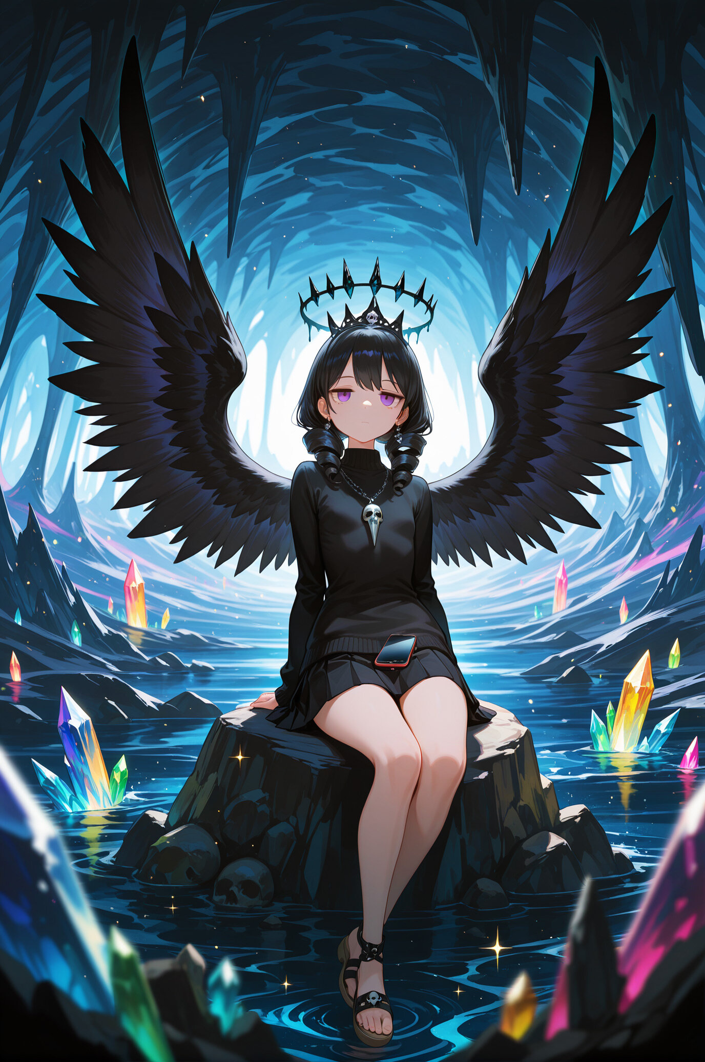 masterpiece, best quality, absurdres, 8k, ultra detailed, aesthetic, very aesthetic, newest, <lora:Fixhands_anime_bdsqlsz_V1:0.5>, <lora:bold-16oa:-0.5>, (realistic:0.3),BREAK (shallow depth of field,Gaussian Blur:1.1),1girl,sitting on the rock,huge crystal,(selfie, smartphone,crystal cave,glowing crystals,colorful crystals,multicolored crystals,fantasy cave,magical atmosphere,sparkles,light particles,glowing,shimmering light,fantasy lighting,soft glow,ambient light,colorful lighting:1.1),black twin drill hair, purple eyes, jitome,expressionless,(tiara, black wings folded behind,jitome:1.1),black halo,small breasts,black sweater,black pleated skirt,sandals,skull motif accessories (necklace, earrings),BREAK <lora:USNR STYLE_XL_loha:0.8>(flat chest,curvy,black hair:1.2),looking at viewer,expressionless,(dark aura:1.4),(wide shot,fisheye:1.3),