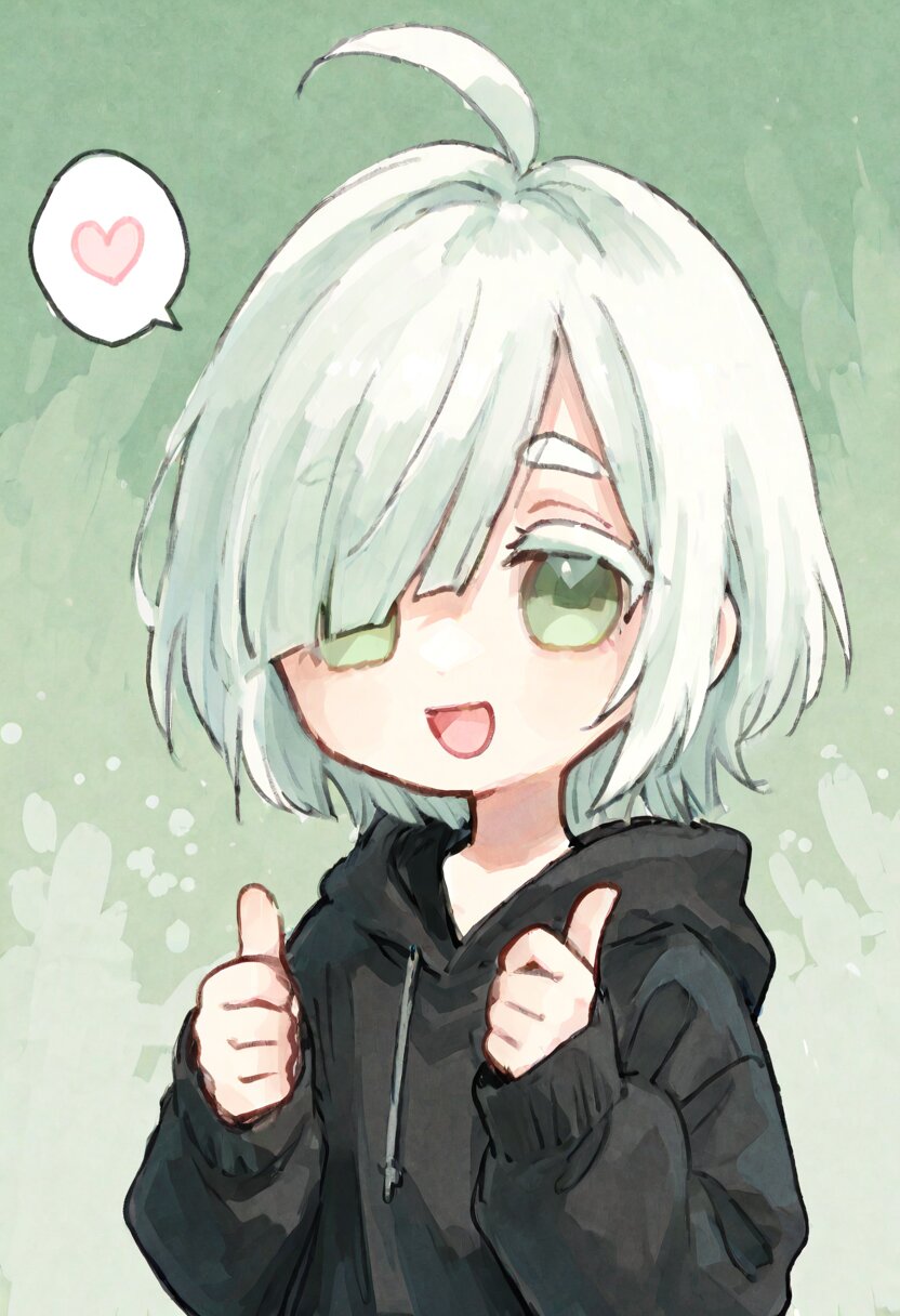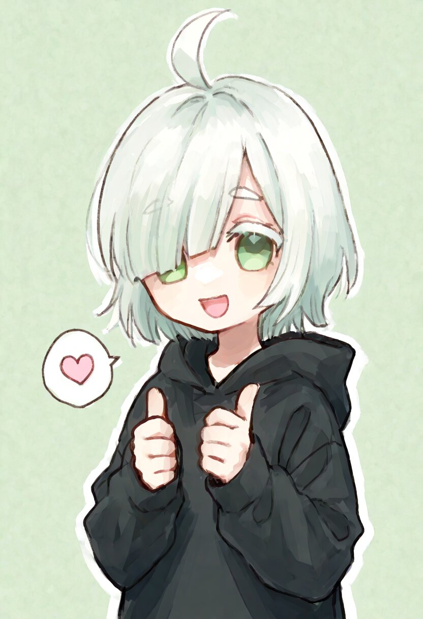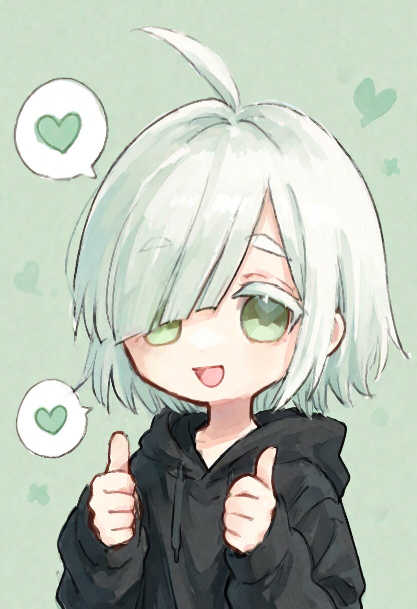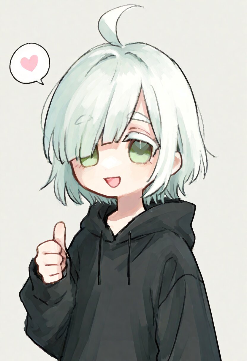<lora:inmnstyleilxl:0.9>, ultra-detailed, best quality, masterpiece, very aesthetic, watercolor painting, general, chibi, solo, 1girl, upper body, thumbs up, spoken heart mark, (bright white hair), short hair, blunt bangs, white thick eyebrow, white colored eyelashes, (hair over one eye), ahoge, mint green eyes, oversize black hoodie, sleeves past wrists, smile, open mouth, looking at viewer