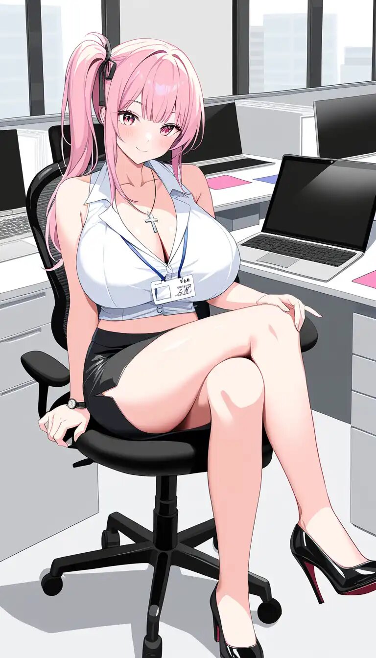 masterpiece, best quality, ultra detailed, 8K, [cleavage]++, [collarbone]++,[office lady]++, [black pencil skirt]++, [white top]++, [crossed legs]++, [full body]++, [high heels]++, [sitting on office chair]++,1girl, solo, [huge breasts]++, perky breasts, hanging breasts, curvy, cross necklace, [sleeveless]++, bare shoulders, bare arms, [midriff]++, bare legs, [tall]++, [long hair]++, [straight hair]++, [shiny skin]++, [shiny clothes]++, smile, blush, closed mouth, office, laptop, [name tag]++, indoors, desk, [high side ponytail]++,