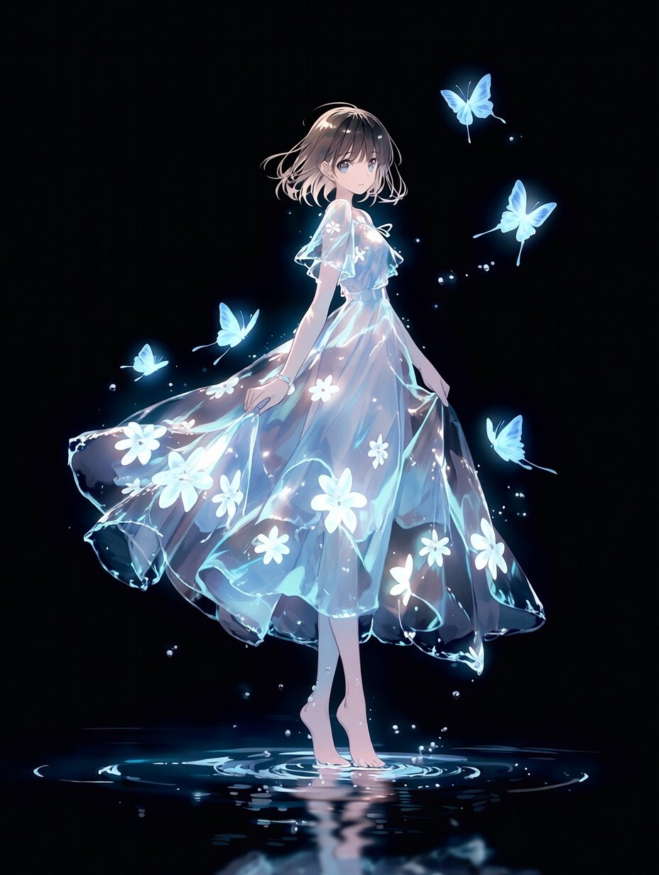 A young woman is standing barefoot in the center frame in shallow water. She has short brown hair and is dressed in a flowing translucent dress decorated with glowing white flower patterns and light blue highlights. The fabric of the dress seems to blend in with the water. Her pose is calm, her head slightly tilted sideways. There are several shining ether-like blue butterflies flapping around her. The water under her feet reflects her shape and butterflies, creating a mirror-like effect. The background is a black color that emphasizes bright subjects. The overall style is reminiscent of anime and manga, and the soft lighting effect makes the image dreamy and magical.