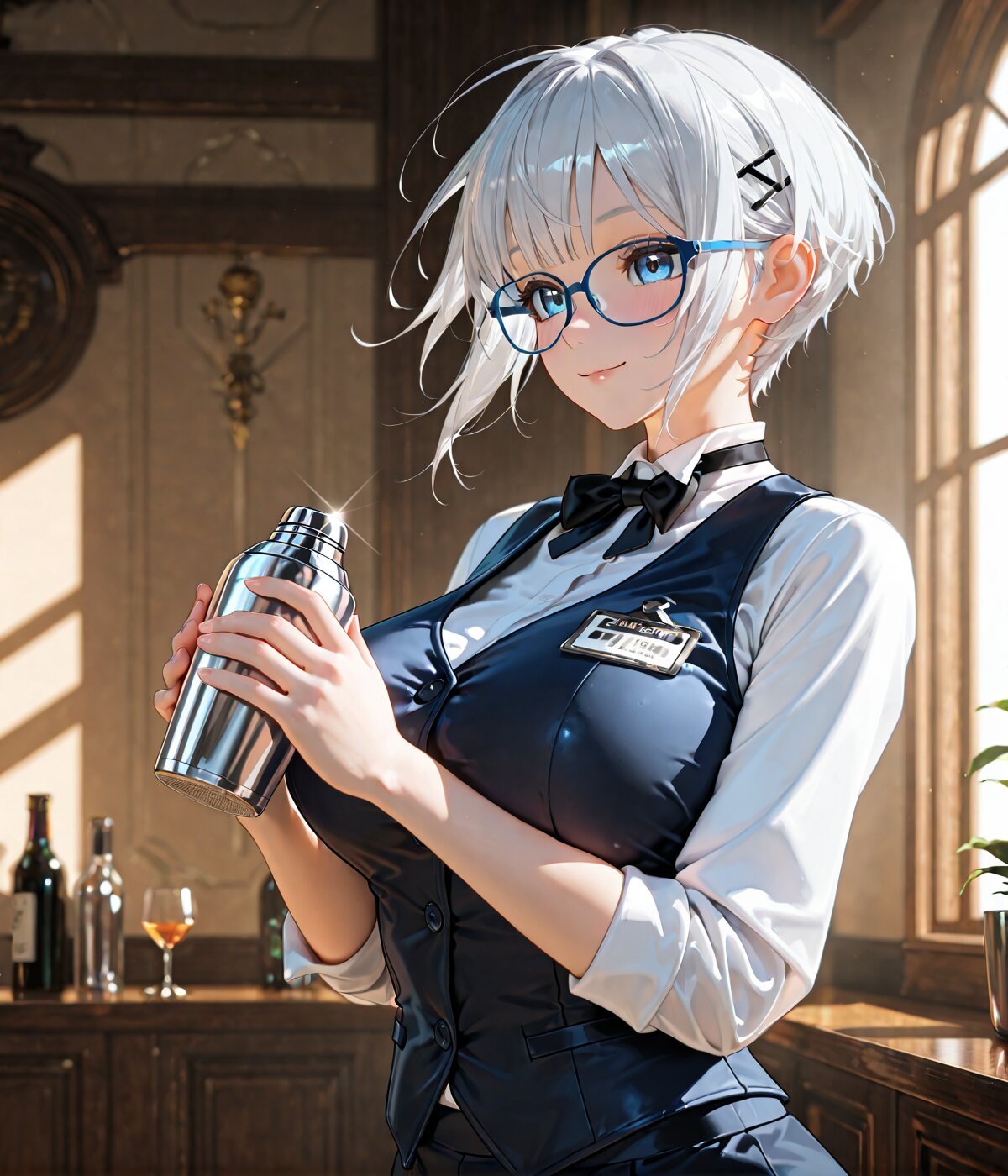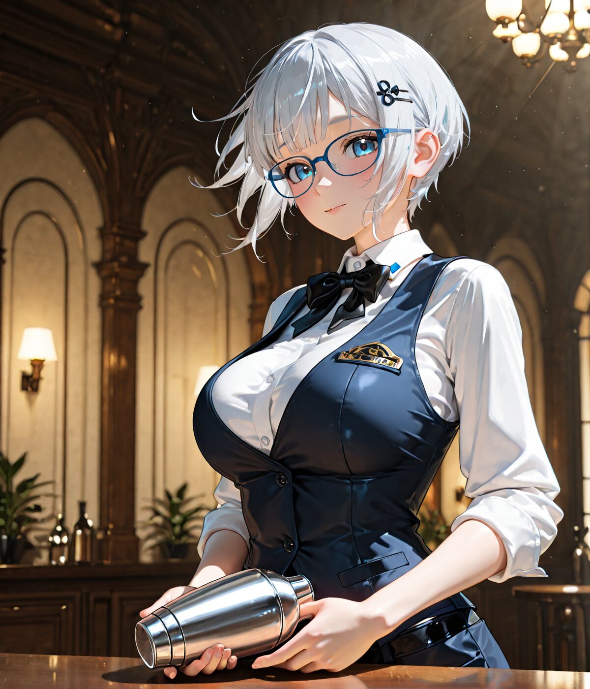 masterpiece, best quality, amazing quality, 4k, very aesthetic, high resolution, ultra-detailed, absurdres, newest, scenery, 3d, rendered, backlit, blue glasses, silver hair, hairpin, very short hair, choppy bangs, =v=, blue eyes, white blue, 1girl, female bartender outfit, vest over white shirt, black bow tie, cocktail shaker, stylish and confident atmosphere, large breasts, cowboy shot, portrait, dynamic, floating hair, BREAK, hands, fingers, vignetting, dramatic shadow, cinematic lighting, rim light, detailed background, depth of field, vignetting, volumetric lighting