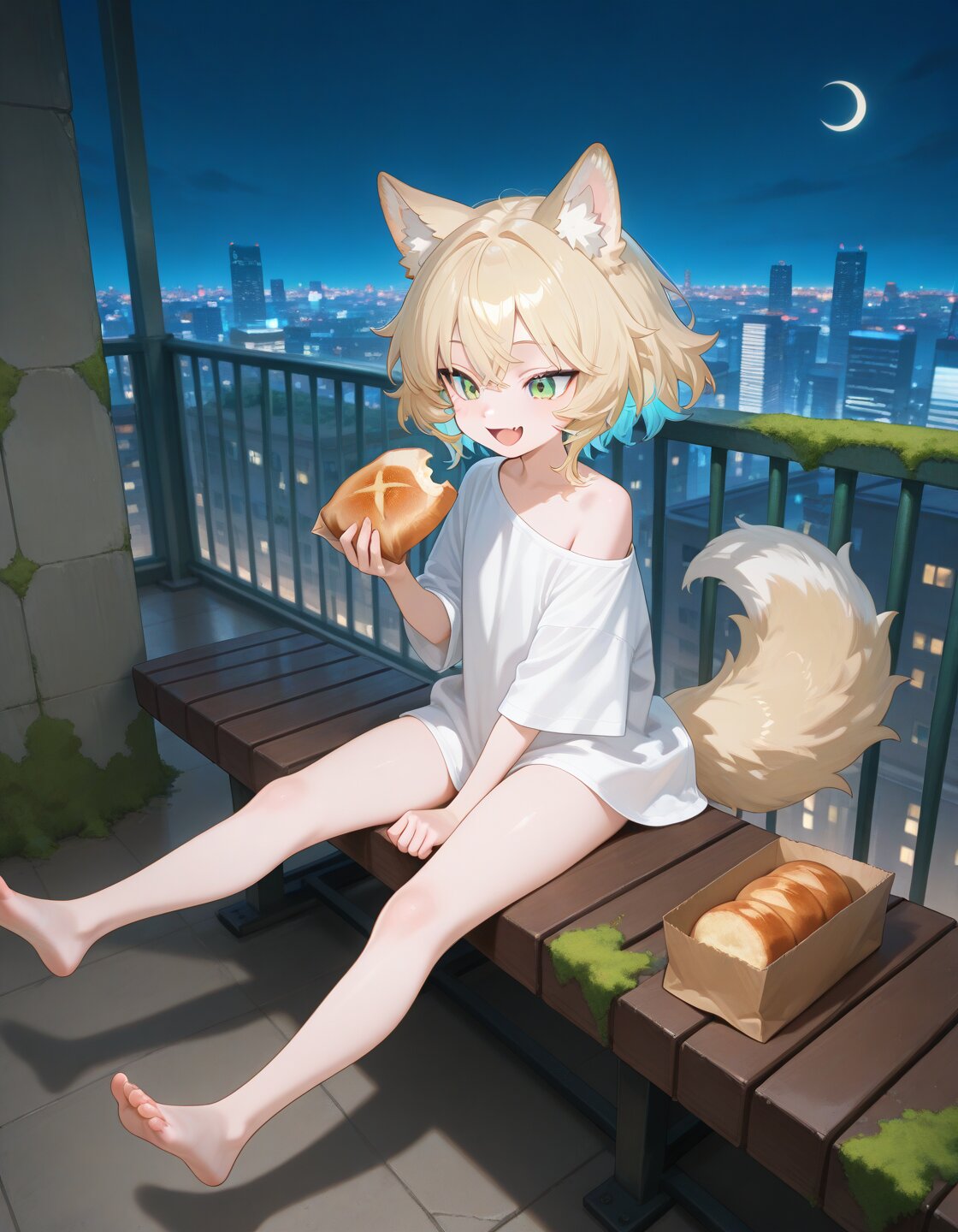 1girl, sensitive, (beautiful eyes, detailed eyes), three quarter view, looking at food, solo, cute, full body, wide shot, rooftop, cityscape, skyline, night, half moon, moss, wolf girl, wolf ears, wolf tail, colored inner hair, blonde hair, blue hair, short hair, fluffy hair, flat chest, (tsurime:1.2), green eyes, fang, oversized shirt, bottomless, single bare shoulder, sitting, damaged, bench, holding bread, food bite, outstretched legs, open mouth, smile, happy, masterpiece, best quality, amazing quality,