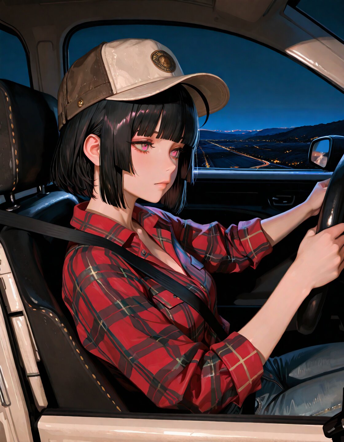 solo,1Girl,ahoge,Pink eyes,Black hair,blunt bangs,short hair,hime cut,delicate face,detailed face,detailed skin,delicate hair,detailed hair,green eyes,masterpiece,best quality,insanely detailed,beautiful,16k,photorealistic,absurdres, A strong and confident female truck driver,expressionless,driving a massive truck,holding steering wheel,wearing a casual yet practical outfit including a plaid shirt,denim jeans,Trucker Hat,the truck detailed with polished metal and large wheels,a rugged highway landscape in the background,a sense of independence,seatbelt,at night,upper body,chill atmosphere,directional light,from side