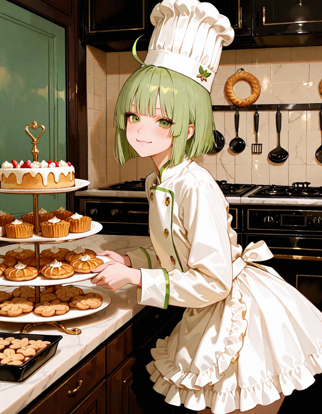 solo,1Boy,ahoge,Green eyes,Green hair,blunt bangs,short hair,straight hair,hime cut,delicate face,detailed face,detailed skin,delicate hair,detailed hair,green eyes,masterpiece,best quality,insanely detailed,beautiful,16k,photorealistic,absurdres, happy,cheerful expression,fun and playful,pastry chef outfit, white double-breasted coat, tall chef hat, frilled apron, neat skirt, professional but cute look, in the kichen of pastry,baking desserts,almond tarts,peanut cookies,fruit cake,vibrant scene,sweet and delightful,nutty joy,vibrant and delicious,snack with joy,Scene of Pleasure,cute,side view,looking at viewer,