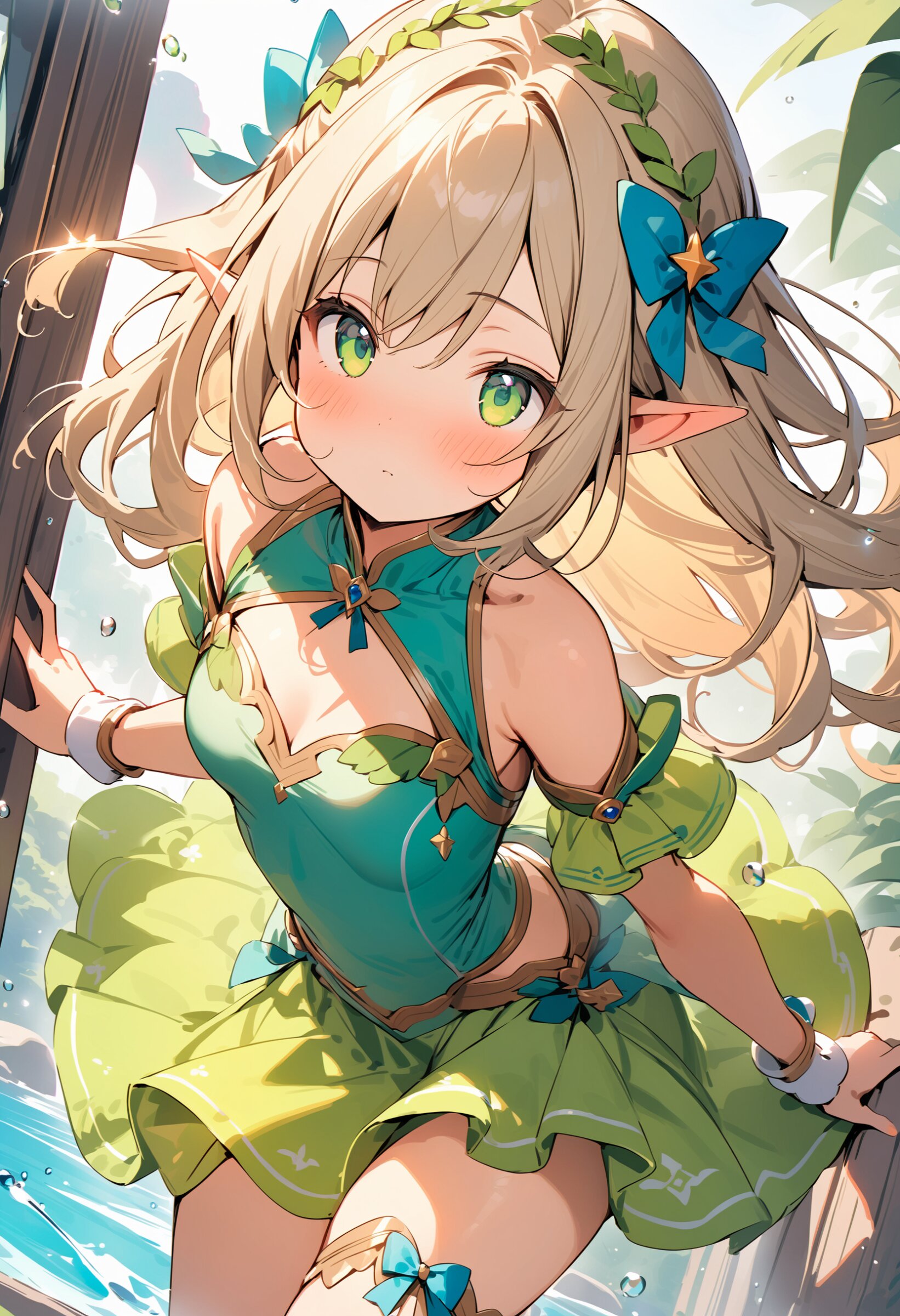 ((masterpiece)), ((best quality)), ((kawaii)), cute, (lovely), ((extremely detailed)), (beautiful), dynamic angle, a cute girl, 1girl, solo, ((elf)),beautiful blond hair, beautiful green eyes, ((beautiful eyes)), long hair, fantasy clothes,
