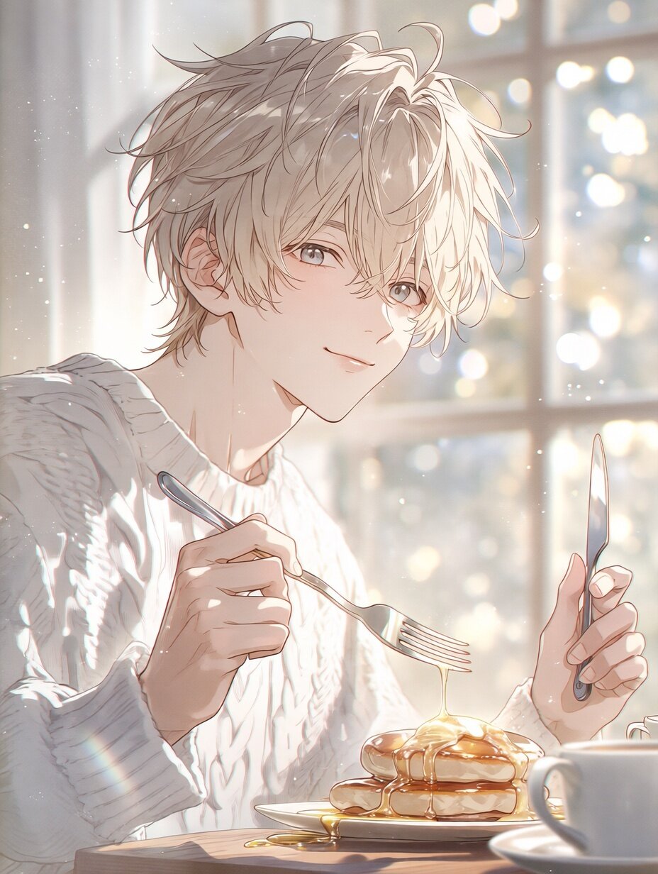 (masterpiece, best quality, highres, 8k wallpaper:1.2), extremely detailed, (ultra-detailed eyes, sparkling eyes:1.1), (soft lustrous skin), beautiful young man, bishounen, refined and gentle aura, slim and elegant build, soft facial features, calm and charming expression, slightly smiling lips, clear eyes filled with warmth, wearing a white knit sweater, soft texture, cozy and pure impression, sleeves slightly loose, eating pancakes, holding a fork in one hand and a knife in the other, graceful hand pose, syrup-glazed fluffy pancakes on a plate, butter melting slowly, sweet and tender daily-life moment, (cinematic lighting), (soft focus), warm morning light streaming in, skin-flattering soft illumination, tyndall effect, bloom, gentle rim lighting outlining hair and shoulders, (glowing light:0.8), dynamic angle, depth of field, rule of thirds, looking slightly toward the viewer with a soft, intimate gaze, stylish café interior, wooden table, white ceramics, sunlight through the window, floating dust particles, softly blurred background, bokeh, airy and transparent atmosphere, calm happiness, romantic daily scene, emotional, commercial-quality illustration