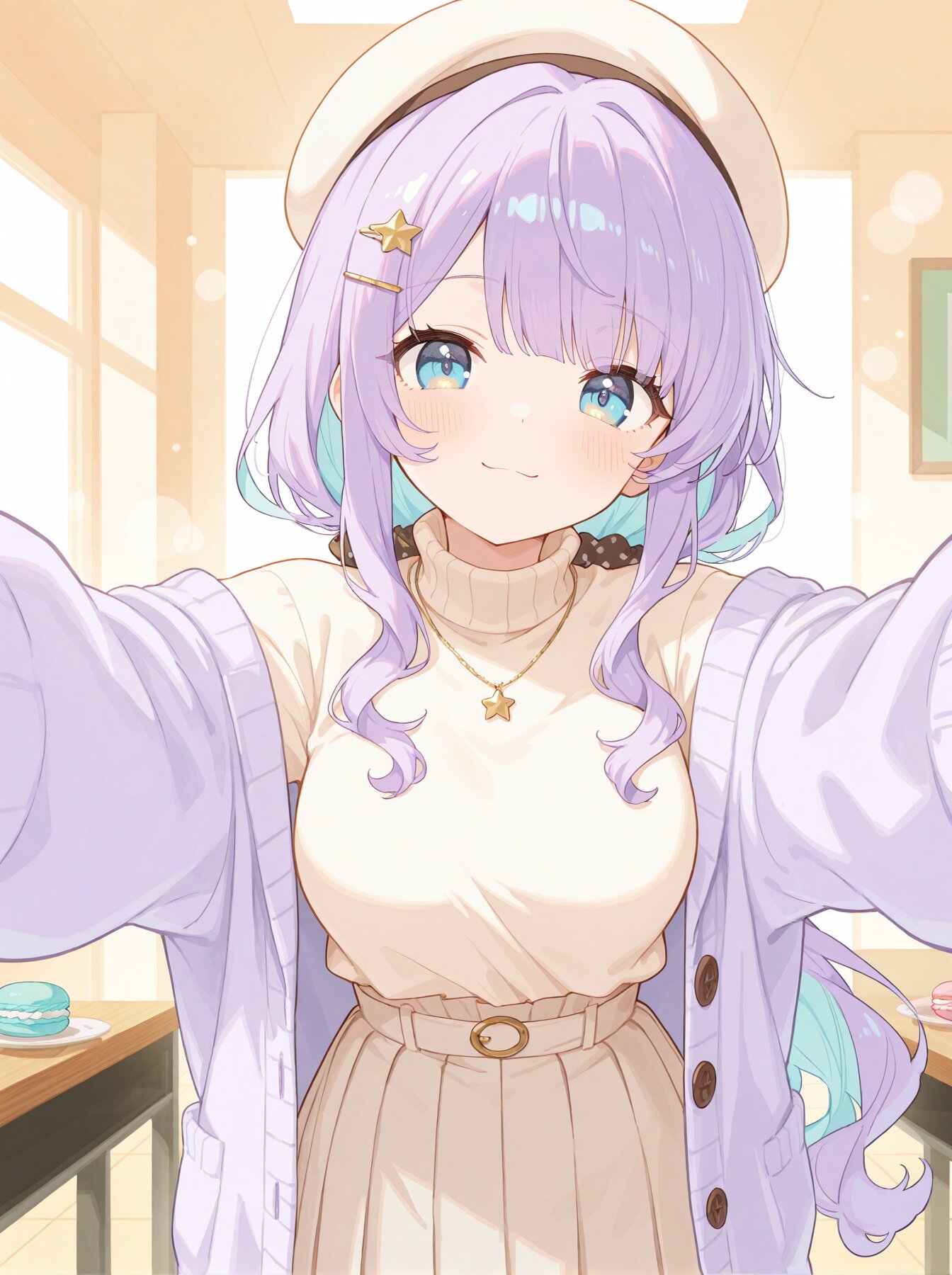 cute everyday food court scene, viewer POV, the character leaning slightly forward and offering a pastel-colored macaron directly toward the viewer, hand extended in the foreground, mouth gently open as if saying “aahn”, playful and sweet expression, soft smile in the eyes, upper body or half-body composition, strong depth with the macaron closest to the camera, casual pastel outfit suitable for daytime, light and soft fabric, hair styled neatly with a natural, airy feel, slight movement in the strands, bright indoor lighting like a food court, softly blurred background with tables and lights, warm, friendly, and cozy atmosphere, daily-life sweetness, soft lighting, clean and cute composition, (soft pastel color palette:1.5), (pale colors:1.3), watercolor texture, matte finish, subtle shading, minimal contrast,, (masterpiece:1.3), (best quality:1.2), dreamy pastel bokeh, soft rim light, crisp anime lineart, soft cell shading, high detail, elegant atmosphere, white turtleneck blouse tucked into a beige pleated skirt, light purple checkered long cardigan, matching beret, delicate gold accessories,, soft anime face, teenage, pastel purple hair, (light blue inner hair:1.3), fluffy long hair, loosely wavy hair, soft flowing hair, straight-cut bangs, star-shaped hairpin, calm violet eyes, medium breasts,, low ponytail tied at the nape with a fabric scrunchie, hair brought forward over the chest (front drape), straight-cut bangs, a few loose face-framing strands, silky texture, softly wavy ends