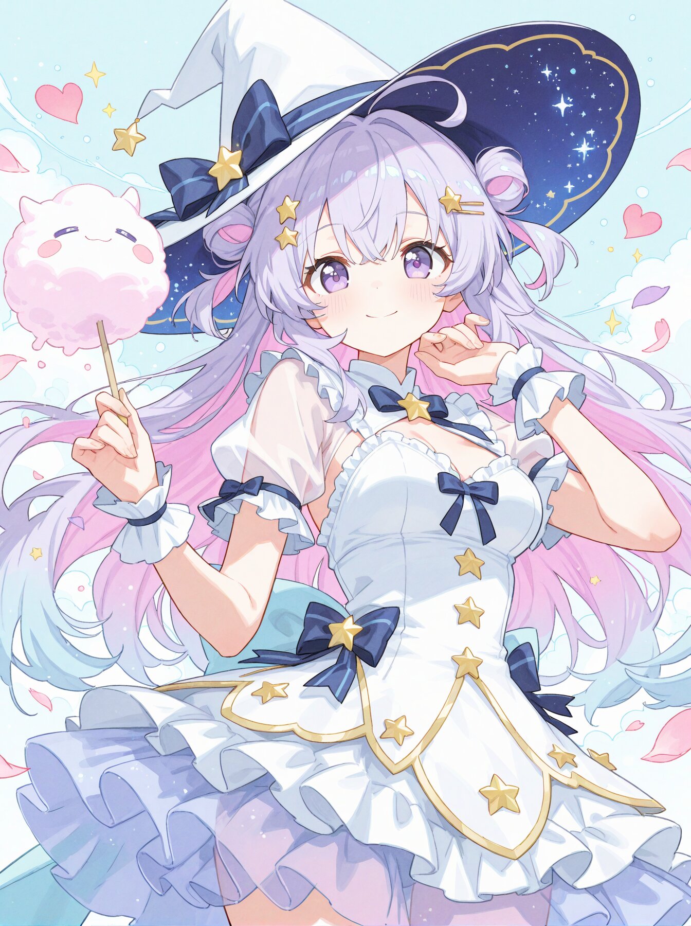 Another world, magic, energetic poses, macaron slime, cotton candy dragon,, (soft pastel color palette:1.5), (pale colors:1.3), watercolor texture, matte finish, subtle shading, minimal contrast,, (masterpiece:1.3), (best quality:1.2), dreamy pastel bokeh, soft rim light, crisp anime lineart, soft cell shading, high detail, elegant atmosphere, Pastel color palette, (Upper body: 0.9), soft cute girl with soft lavender hair and light blue inner highlights, long hair with two side buns and loose curls, one stray hair, large, bright purple eyes, a gentle smile, a faint glow, anime-style with emphasized contours, flat pastel-toned shading.single ahoge, medium breasts,star-shaped hairpin,, soft glow, sparkles, floating petals, fluffy textures, star motifs, heart motifs, translucent fabric, soft frills, magical atmosphere, gentle light, dreamy background, faint clouds, cute accessories, subtle rainbow tones, dreamy magical atmosphere, floating soft particles, gentle sparkles, translucent fantasy witch outfit, frilly layered dress with star and moon motifs, wide-brim witch hat with ribbon and star accents, magical glow effects, star motifs, heart motifs, translucent fabric, soft frills, magical atmosphere, floating petals, dreamy background, subtle rainbow tones