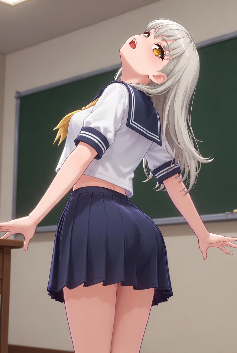 An anime-style illustration of a slim, athletic Japanese high school girl with gradient gold-to-orange eyes and long silver hair, dressed in a Japanese high school uniform with the skirt length at knee height. She leans backward about 25 degrees, chest open, head tilted back so her chin lifts upward, arms slightly raised and spread outward at about 20–30 degrees, elbows relaxed and hands loosely open, expressing emotional release or dramatic emphasis. Her weight is on her heels, legs straight, torso arched mainly from the upper back and neck, looking at the viewer. The scene is set inside a high school classroom with a simple, minimalist, nostalgic atmosphere. The composition is a back view, focusing on her back and side buttocks facing the viewer, with clear focus on facial details. The style features soft rendering, clean noise, a flat drawing approach with gentle shading, and smooth lines. The mood is stylish, confident, slightly edgy, yet approachable, with vibrant, highly detailed, and aesthetic visuals.