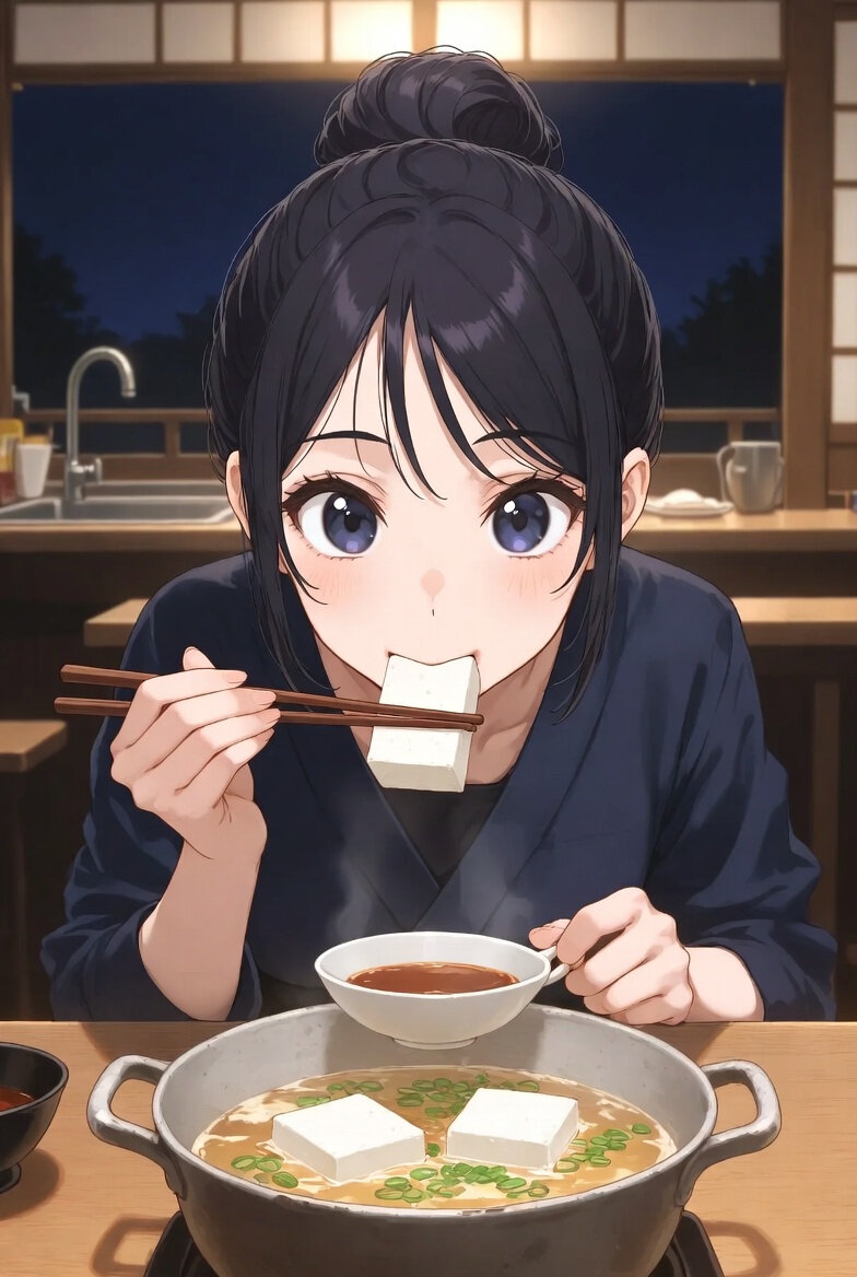 鍋料理である湯豆腐をたべる日本人女性28歳のイラスト。背景は日本のダイニングキッチン。時刻は夜。 鍋料理は、湯豆腐。鍋はとても小型なモノ、透明なスープに、刻まれたネギがたくさん入り。2切れの小さな豆腐が入っている。
