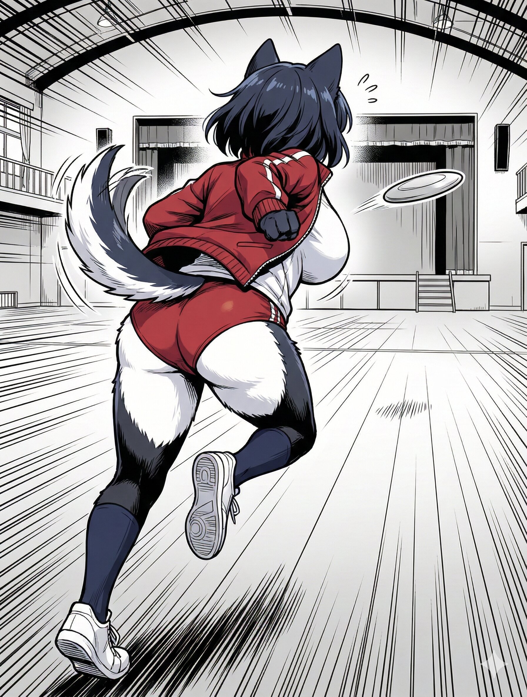 イラストのキャラクターをGペンでペン入れする。2D。カラー。強めの陰影とコントラスト。線は細く薄くする。小柄で背が低い。バストとヒップを大きく、長くする。腰が細い。キャラクターの特徴をそのままに、構図とポーズを変更する。衣服はチャックが開いた赤いジャージのジャケット、白いジムシャツ、赤いジムショーツ、紺色のハイソックス、白いスニーカー。奥に投げられたフリスビーを、尻尾を振りながら追っている。太腿の内股が白い毛、脚の外側が黒い毛。背景は体育館で、ステージが奥に見える。陰影はペン書き。キャラクターを背後から見ている。キャラクター自身の動作の線と速度線が出ている。完全に新しいイラスト。グラデーションを追加。