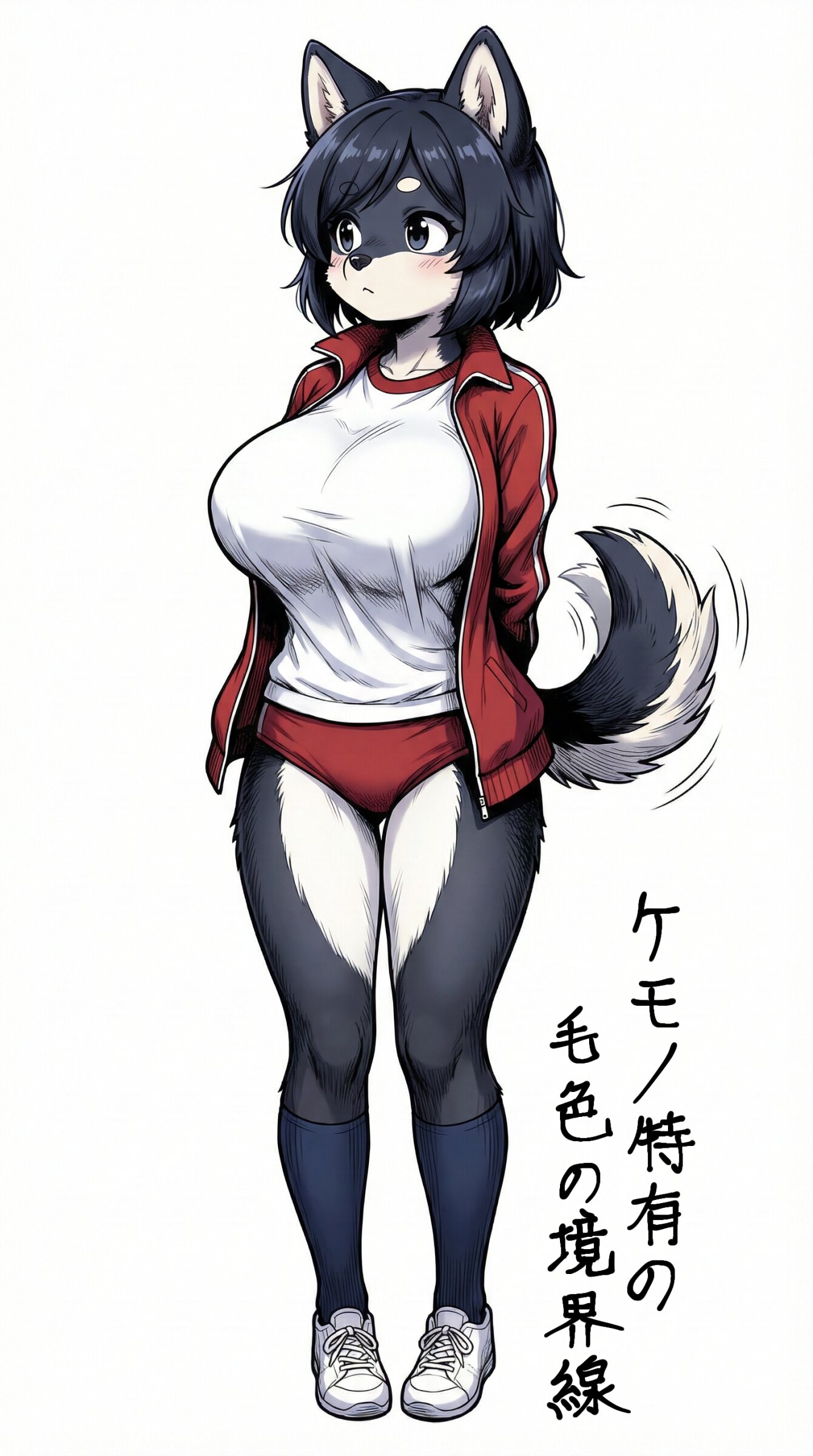 イラストのキャラクターをGペンでペン入れする。アスペクト比9:16の2Dイラスト。カラー。強めの陰影とコントラスト。線は細く薄くする。小柄で背が低い。バストを大きく、長くする。腰が細い。キャラクターは黒い柴犬のケモノで、黒い柴犬の耳と丸まった尻尾を持つ。キャラクターの特徴をそのままに、構図とポーズを変更する。衣服はチャックが開いた赤いジャージのジャケット、白いジムシャツ、赤い体操着のショーツ、紺色のハイソックス、白いスニーカー。ジムシャツの裾はショーツの中に入れている。尻尾を振っている。太腿の内股が白い毛、脚の外側が黒い毛。背景は白。陰影はペン書き。キャラクターを真正面から見ている。キャラクターは両足を閉じながら両手を背後に回して、顔を左に向けて何処かを見ている。キャラクターの尻尾の動作線が出ている。完全に新しいイラスト。グラデーションを追加。