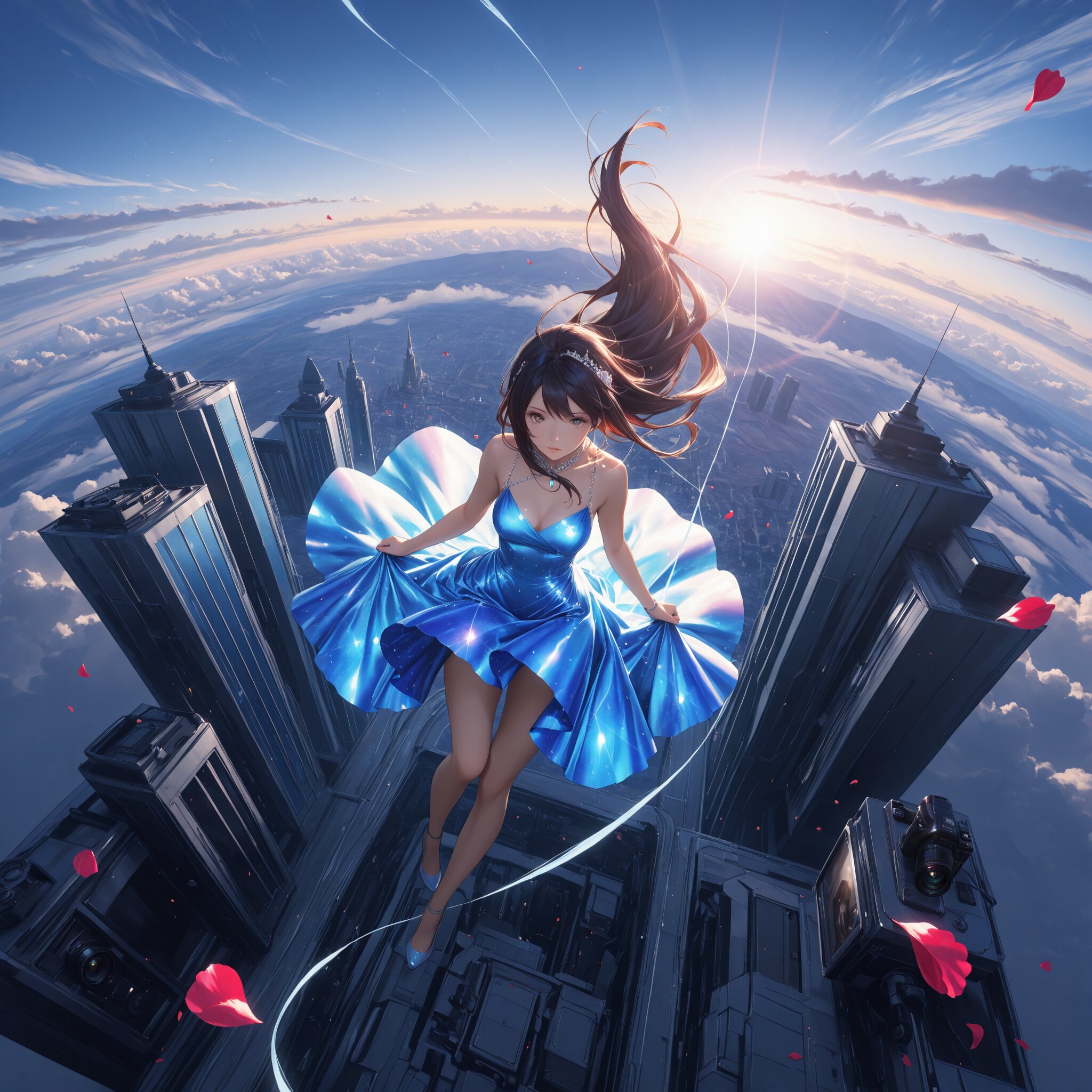 masterpiece, best quality, photorealistic, sharp focus, cinematic lighting, depth of field, beautiful composition, vibrant colors, ultra high res, 8K, highly detailed, masterpiece, best quality, very detailed, (masterpiece:1.2), (best quality), (ultra-detailed), 1girl, solo, beautiful heroine falling from the sky, mid-air jump, zero gravity, hair and silk dress flowing upwards in complex patterns, extreme high angle, looking down at the viewer, vast city landscape below, clouds and lens flare, countless rose petals scattering in the wind, vibrant colors, breathtaking motion, cinematic camera angle, masterpiece composition, extremely detailed environment.