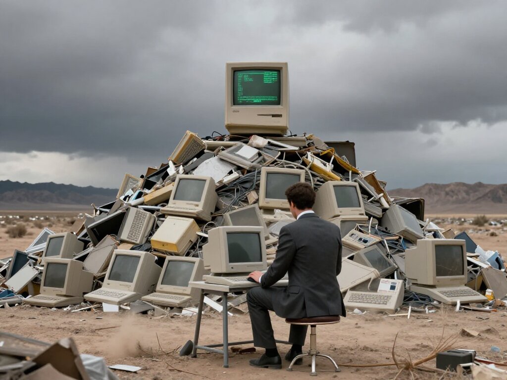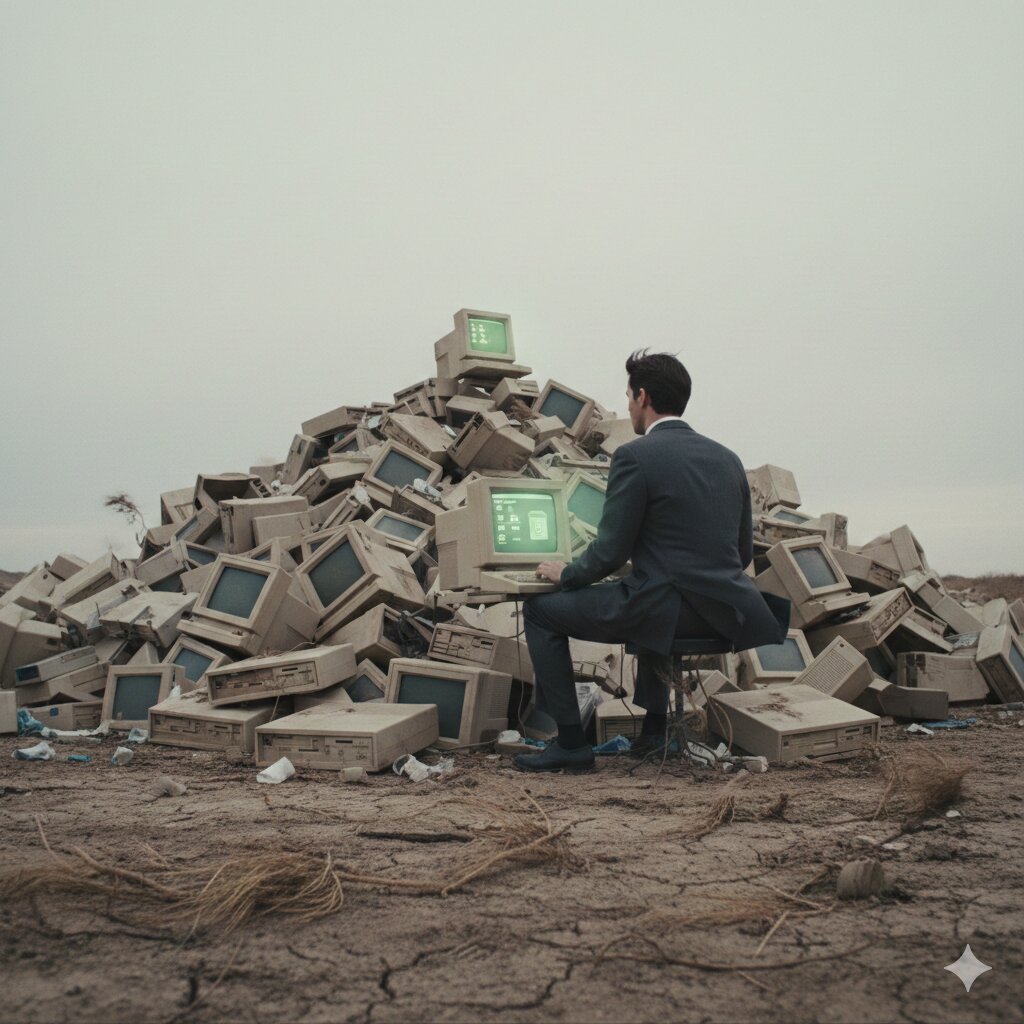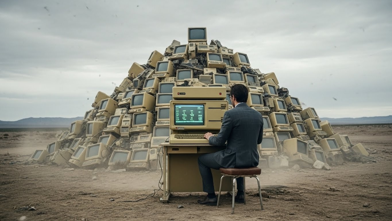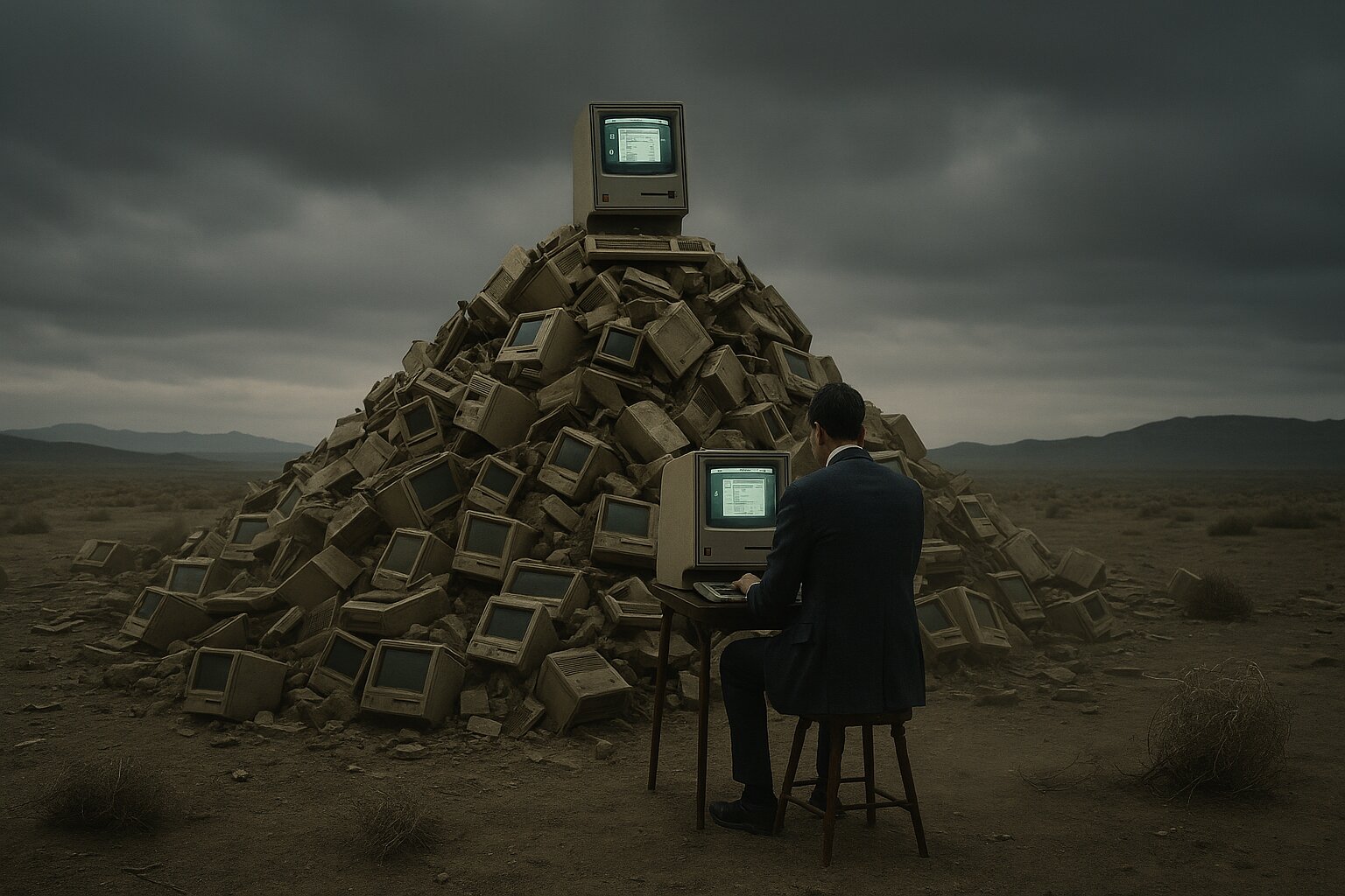 Cinematic wide shot of a desolate, vast landfill in the Utah desert under a heavy, overcast grey sky. In the center, a monumental mountain of thousands of discarded Apple Lisa computers, their beige plastic cases yellowed and weathered. At the very peak of this electronic graveyard, a single Apple Lisa stands upright, its monochrome screen glowing with a faint, eerie green light, displaying a 1983 graphical user interface. A man in a sharp, expensive charcoal-grey Italian suit sits on a simple vintage stool, his back to the camera, silently and meticulously operating the mouse. The air is thick with a sense of profound melancholy and hollow silence. Dust and dry tumbleweeds are caught in a cold, sweeping wind. Desaturated colors, high detail, melancholic atmosphere, photorealistic, 8k resolution.