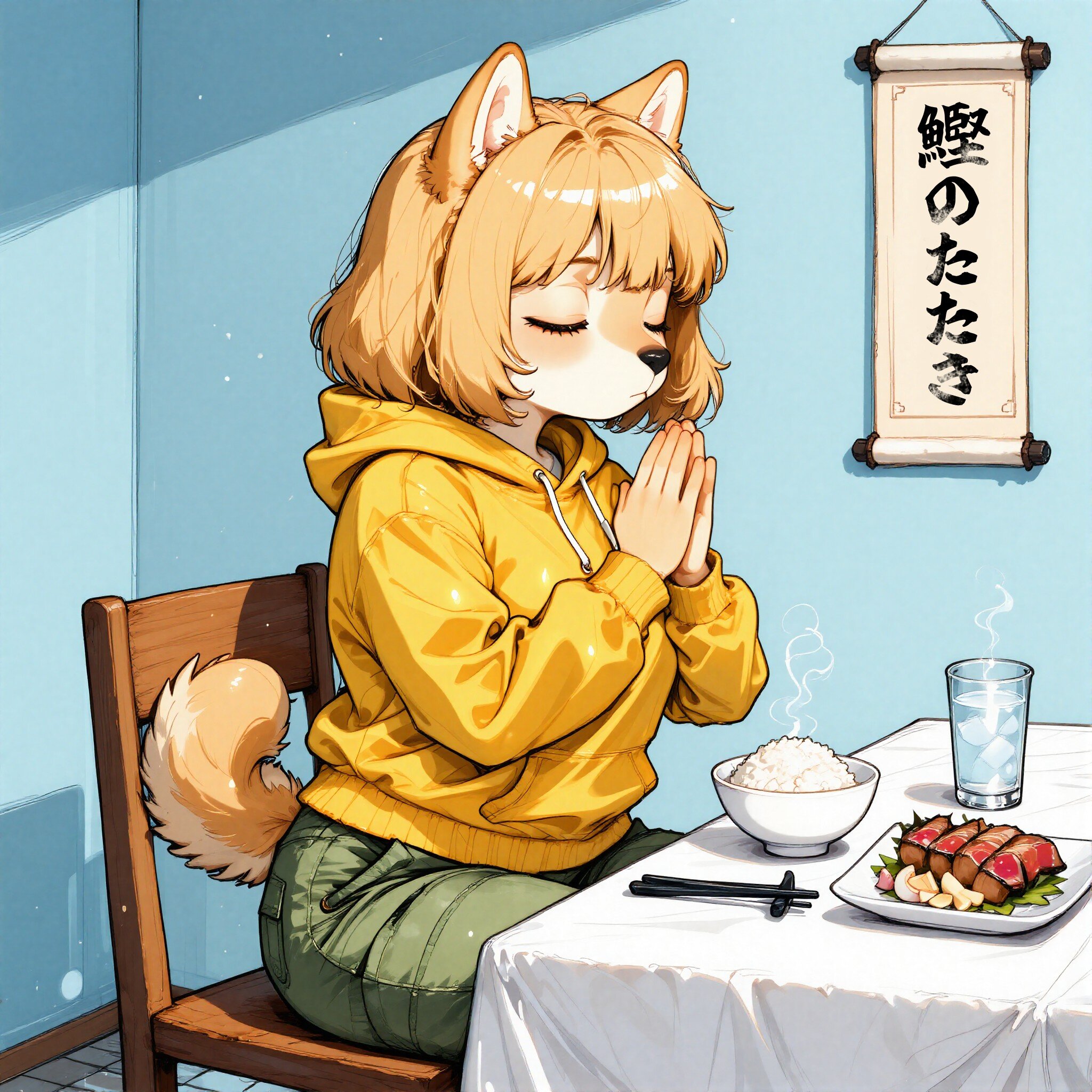 Scene: A character sits at a table, preparing to eat, shown from a side view. Character: A fluffy, anthropomorphic girl with Shiba Inu ears and a large curled tail. She is furry female, 24yo, soft fur texture, and is not wearing her hat, She breasts is massive size. Her appearance is light brown color (same body fur) bob hair with natural bangs, yellow hoodie sweatshirt (very narrow waist with fit, fashion model silhouette), moss green work pants. Action: She sits on a chair with her eyes closed, hands pressed together in a pre-meal gesture (gassho) toward the food in front of her. Environment: A simple light-blue background. On a claen white table in front of her: - A white bowl of steamed rice - A square shape plate of Bonito seared slices, leaving the outside barn and fragrant while the inside stays tender and ruby-colored, onion slices, garlic pieces, and green shiso. - Chopsticks placed on the table - A glass cup filled with ice water A hanging scroll in the upper right reads in ink: “鰹のたたき” Style: 2D anime-style illustration with G-pen inking outline. Bold and strong linework, strong shadows, high contrast, and applied dark tones. Soft color gradients added for depth. Mood: Warm, peaceful, humble, and slightly cute. Technical: Side-view composition. Clear focus on the character’s posture, fluffy fur texture, and the Bonito seared slices. Balanced contrast between character and simple background.