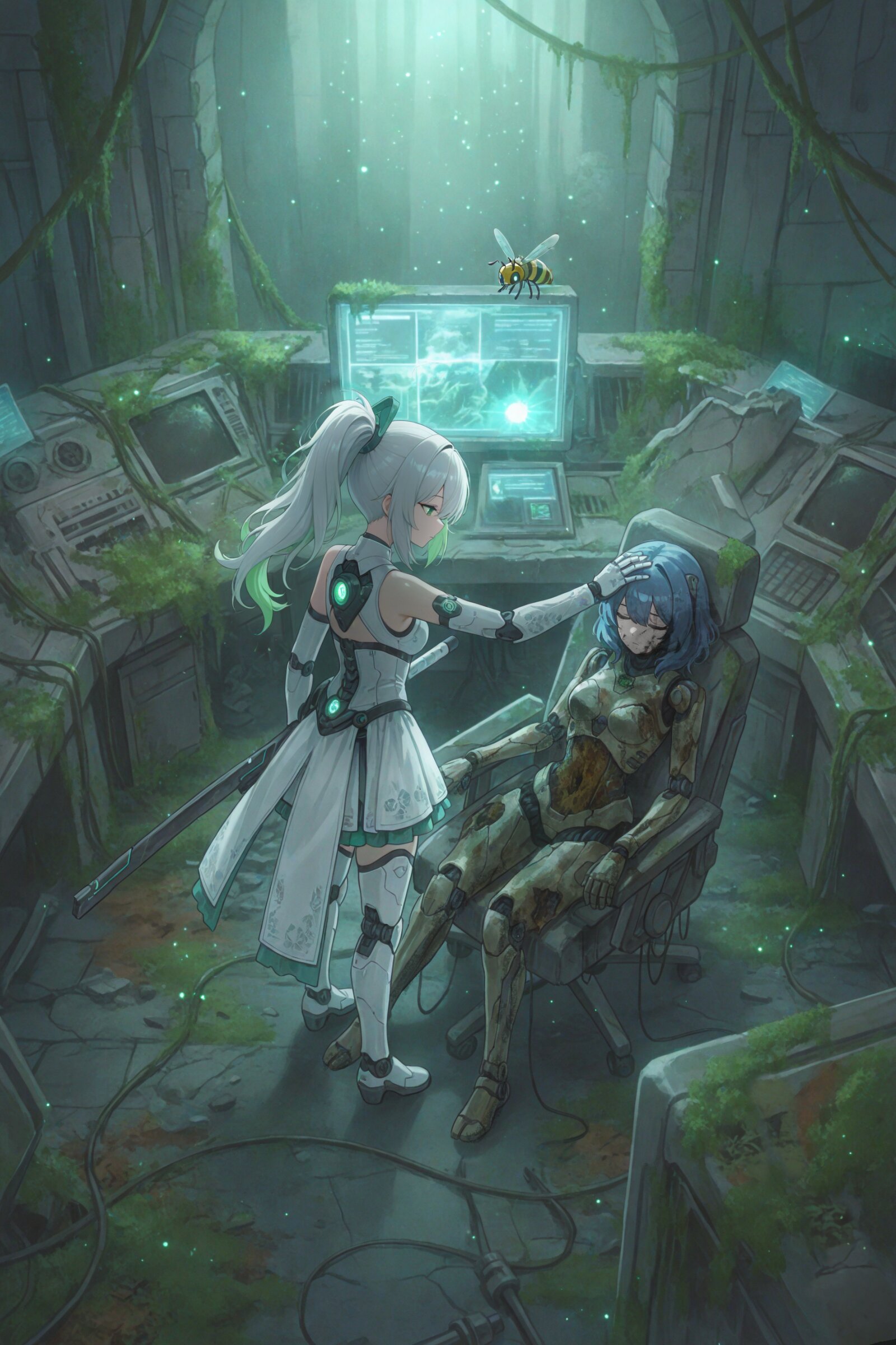 2girls, mecha girls, androids, sci-fi, [Scene]: overgrown ancient ruins, control room, rusted metal, moss, vines, debris, atmospheric lighting, green glowing particles, tyndall effect, [Character 1 (Left)]: standing, white hair, long ponytail, green eyes, white sci-fi dress, mechanical joints, glowing green accents, (gentle expression:1.1), (placing hand on other girl's head:1.3), petting head, paying respects, mourning, looking down, [Character 2 (Right)]: sitting in a broken chair, blue short hair, closed eyes, (inactive:1.2), broken, damaged, wires exposed, slumped posture, corpse, [Details]: (small mechanical bee robot sitting on a monitor:1.2), computer screens, futuristic user interface, super fine concept art, hard surface, 8K, unreal engine, masterpiece, best quality, amazing quality, very aesthetic, absurdres, you can add scenery, (volumetric lighting), To make the background more distinctive. professional art lots of details, , overexposure, shiny-glistening, (watercolor style:1.0), (pastel color style:1.0) 4ur4_illu,shiny, glowing, glowing particles, glowing light particles, light particles, analogous colors darkorange river , <lora:noline (1):-0.5> <lora:sdxl2-flat2-512b:0.0> <lora:facelightup_xl_v10:0.5> <lora:V2_yakumo_alchemy:0.2> <lora:Aura_illu:0.1>
