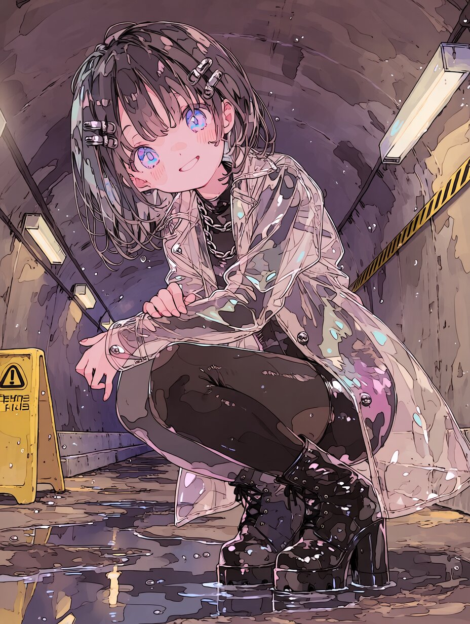 レインコートで夜のトンネル散歩