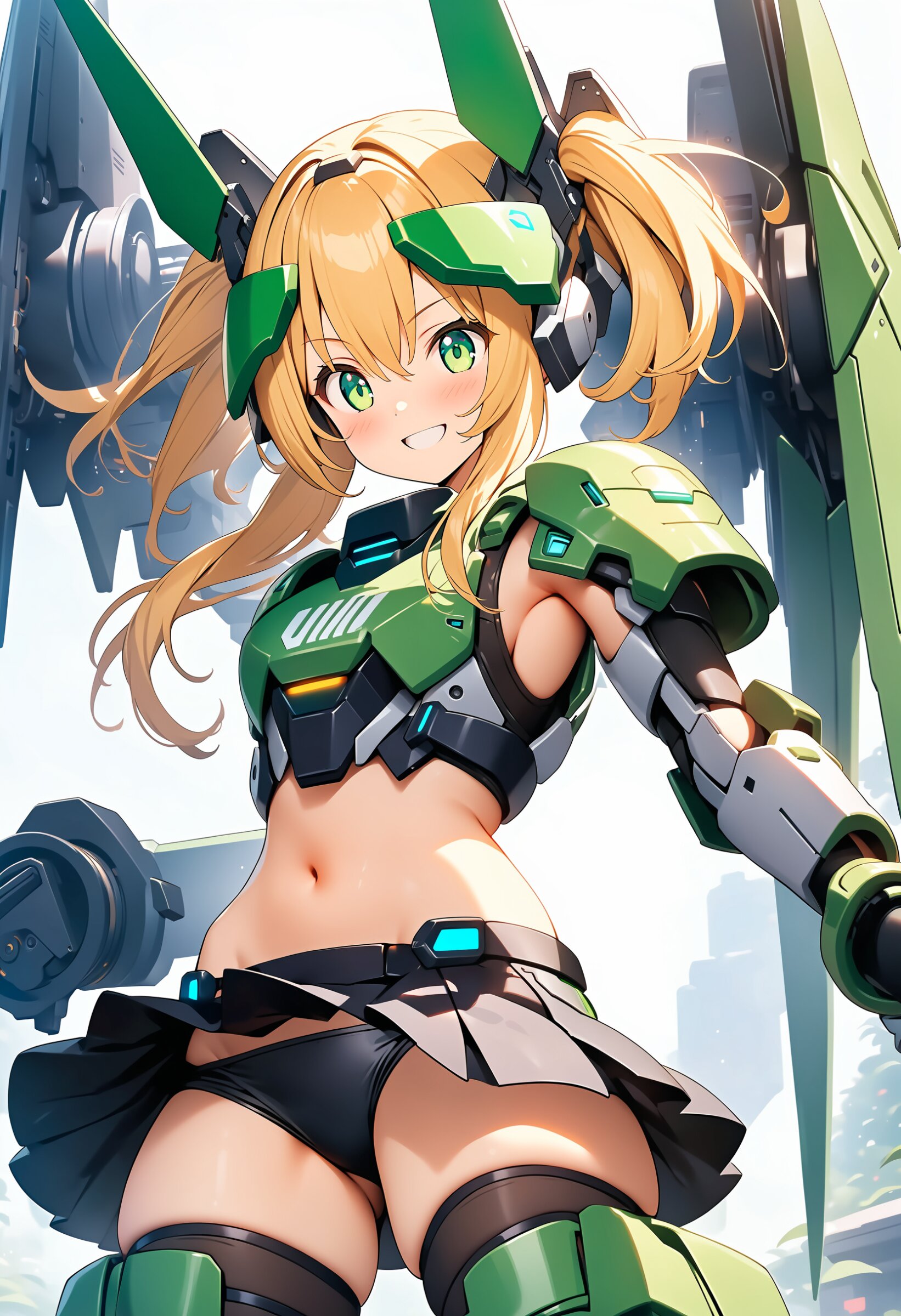 1girl, ((white background)), ultra detailed 8k cg render, masterpiece, high resolution, extremely detailed, mecha musume,mecha shoulder, mech leg, headgear, mecha armor, ((mini skirt)),long blonde hair, dropping green eyes, smile, dynamic posing,