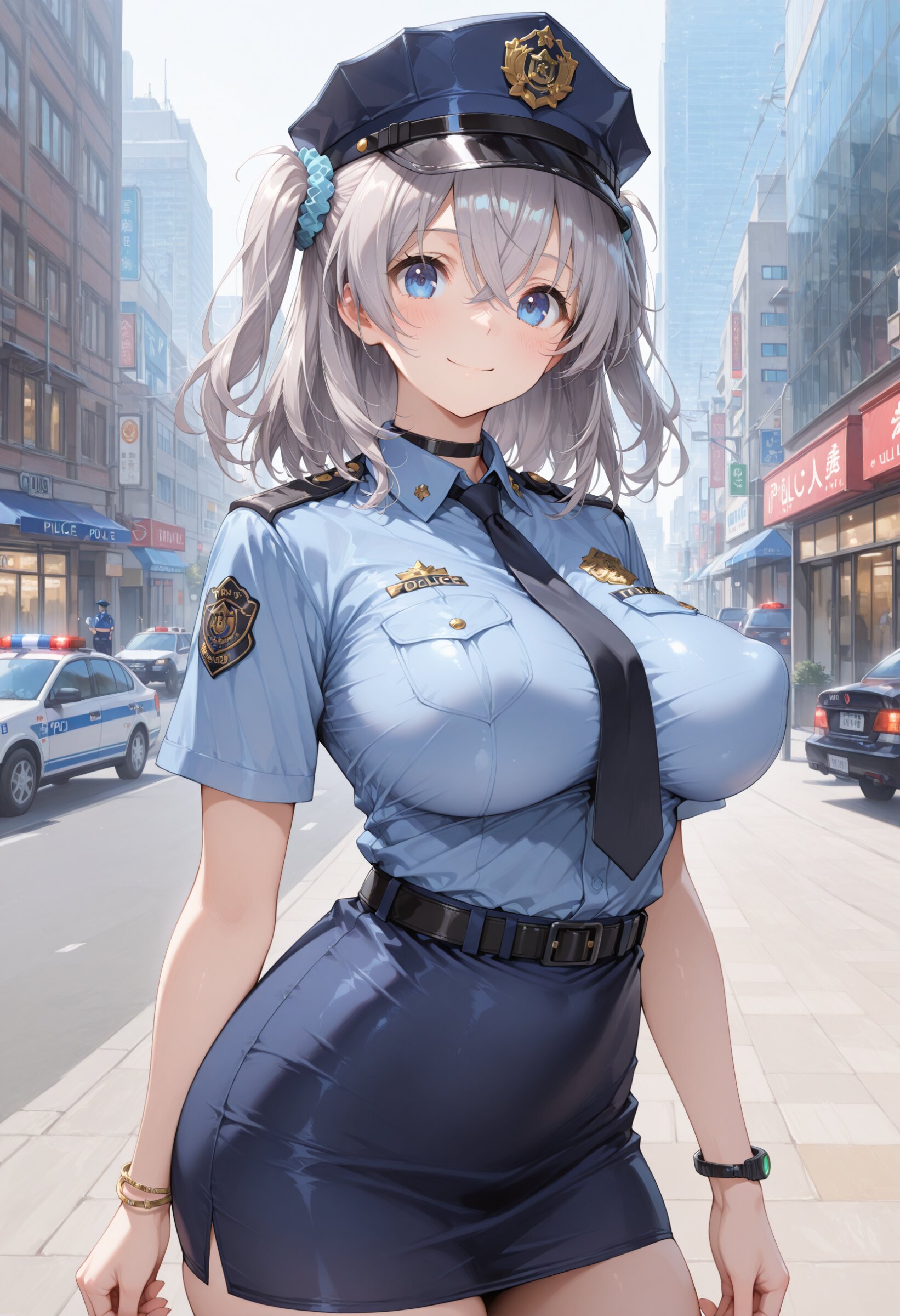 masterpiece, best quality, highres, ultra-detailed, extremely detailed, detailed, 1girl, police officer, police costume, police cap, tight skirt, silver hair, medium hair, crossed bangs, two side up, blue eyes, hair scrunchie, choker, bracelet, big breasts, (perky breasts:1.2), impossible clothes, happy, city, looking at viewer,