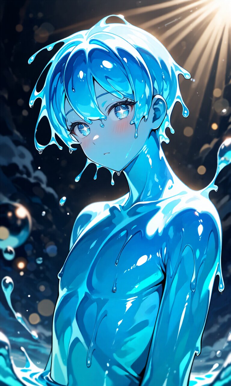 (masterpiece, best quality, highres, 8k wallpaper:1.2), extremely detailed, (ultra-detailed eyes, sparkling eyes:1.1), (soft lustrous skin), **slime boy, humanoid slime male**, **upper body**, beautiful and handsome appearance, youthful slim build, elegant proportions, **transparent blue body**, crystal-clear jelly-like texture, soft inner glow, light refraction inside the body, water-like translucency, smooth glossy surface, subtle gradients of cyan and aqua, delicate facial features formed from slime, **long eyelashes** gently floating within the transparent face, expressive gentle eyes made of condensed light, calm and slightly shy expression, looking at viewer, shoulders and chest sculpted from semi-liquid slime, faint ripples and droplets suspended in midair, (cinematic lighting), soft focus, tyndall effect, bloom, rim lighting enhancing translucency, backlight passing through the body creating luminous edges, (glowing light:0.8), cool and refreshing color palette, depth of field, rule of thirds, **fantasy background**, abstract magical space or watery atmosphere, floating light particles like bubbles, soft mist, bokeh highlights, transparent air, pure and mystical mood, otherworldly charm, cute yet handsome balance, commercial illustration quality, highly polished, emotional, cinematic composition