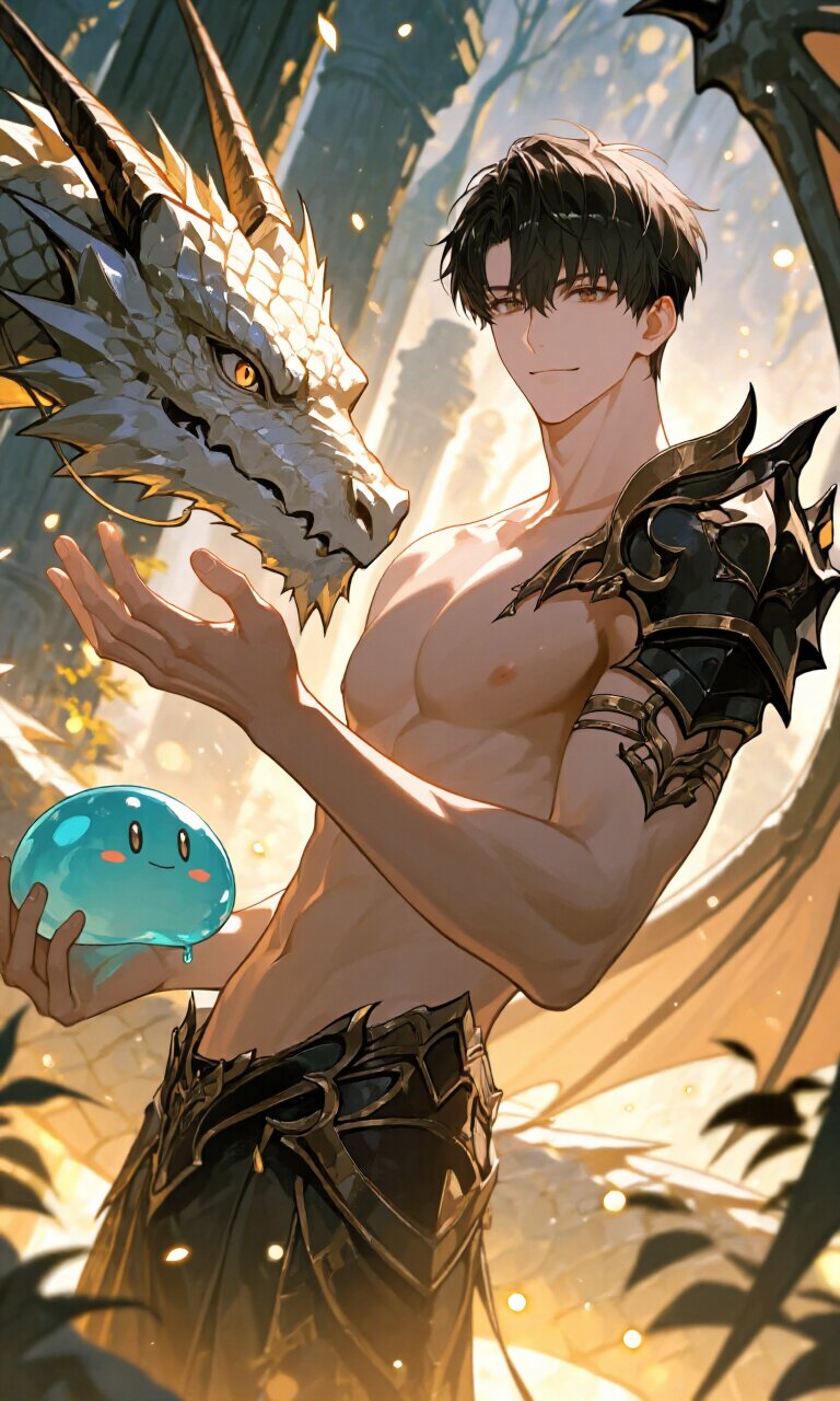 (masterpiece, best quality, highres, 8k wallpaper:1.2), extremely detailed, (ultra-detailed eyes, sparkling eyes:1.1), (soft lustrous skin),1boy, handsome young man**, isekai fantasy setting, slim and athletic build, refined yet wild charm,black short hair** slightly tousled, natural shine,long eyelashes**,warm brown eyes**, calm and gentle expression with quiet confidence, faint smile, looking at viewer,taming magical creatures**, one hand gently reaching toward adragon** and the other toward aslime**, relaxed and fearless posture,dragon** medium-sized, elegant fantasy design, scales shimmering subtly, eyes softened and obedient, lowering its head in trust,slime** small and cute, semi-transparent body, softly glowing, happily clinging near the young man’s feet or hand, (cinematic lighting), soft focus, tyndall effect, bloom, rim lighting outlining hair and shoulders, warm light emphasizing kindness and charisma, (glowing light:0.8), dynamic angle, depth of field, rule of thirds,fantasy background**, otherworldly forest or ancient ruins, floating magical particles, soft mist, luminous plants, subtle bokeh, transparent air, atmosphere of harmony between human and monsters, sense of dominance through gentleness, isekai adventure mood, elegant yet powerful, highly polished commercial illustration, emotional, cinematic composition