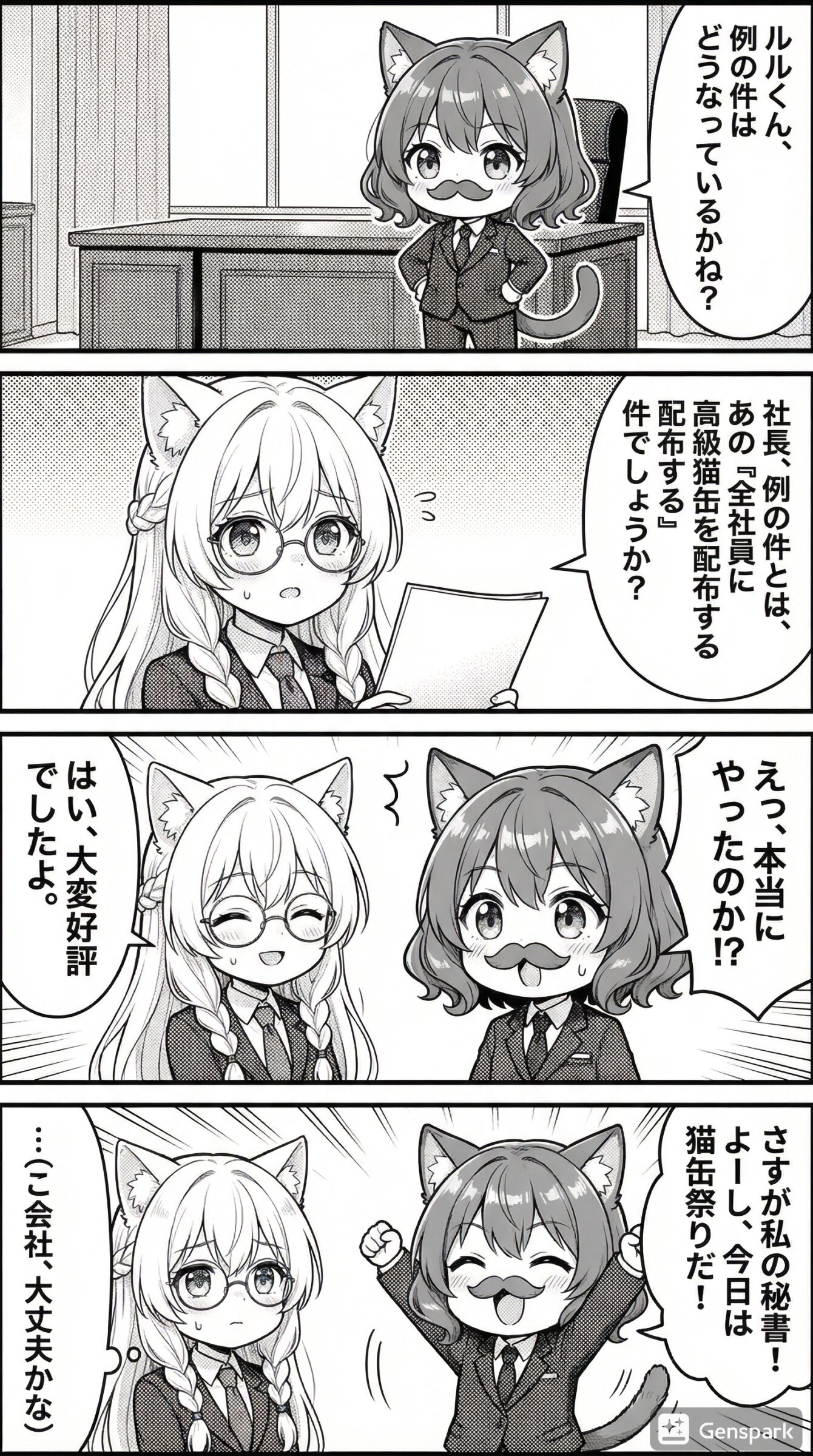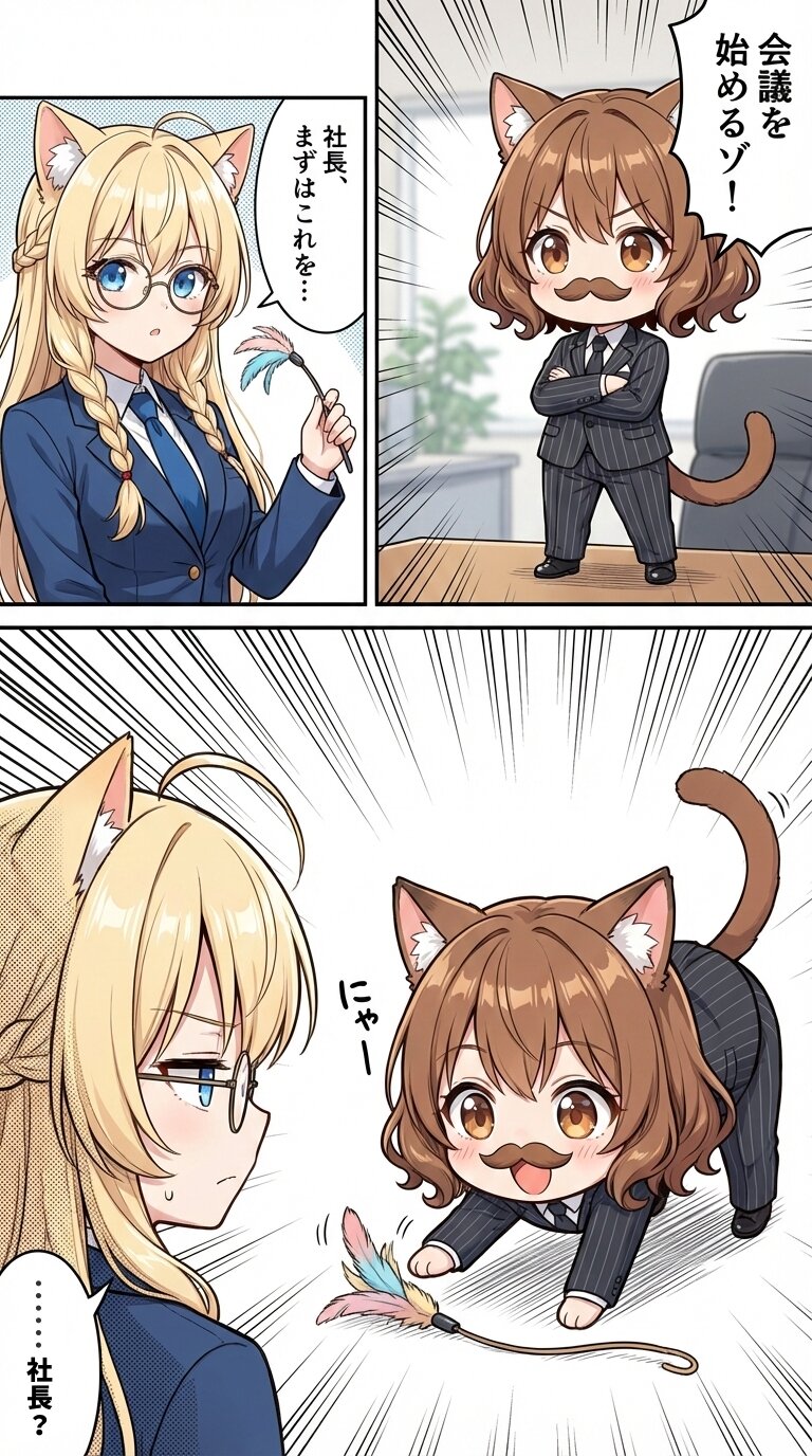 社長、猫につき Yuki 2026/1/15使用したAI Gemini/Nano Banana 年齢制限 全年齢 いいね5 シェア #鈴瑠音ミミ #お仕事 #社長 #秘書 ヒゲ、再び プロンプト 茶髪猫耳娘(社長)の「ミミ」と金髪猫耳娘(秘書)「ルル」が登場するユニークな短編漫画を作って。セリフはすべて日本語。右から左へ読むことを前提としたセリフ配置。 ネガティブプロンプト Steps Scale Seed Sampler Noise Strength コメント 送信 Yuki 2025年6月より活動開始 245投稿54フォロー60フォロワー 猫耳推しの初心者です🐾 フォローする 他の作品 全てを見る 鼓舞を奏でる舞をあなたに 王国の守護者、ドラゴンナイト ルルのマジカル・キッチン 成人の日 餅・粉☆砕! 110番はこんなとき! とんち、通ります きたれ猫年!🐾 ミミ&ルルの、ゆく年くる年🐾 スノボでGO! 姉妹ですべるよ!🐾 マジカル・レインボーまくら ねこみみこカフェOPEN🐾 ふたりのハッピーカラー 宵藍リボン🎀 完璧な冬コーデ 静かな冬の中で 干支になりたかった猫 もっと見る